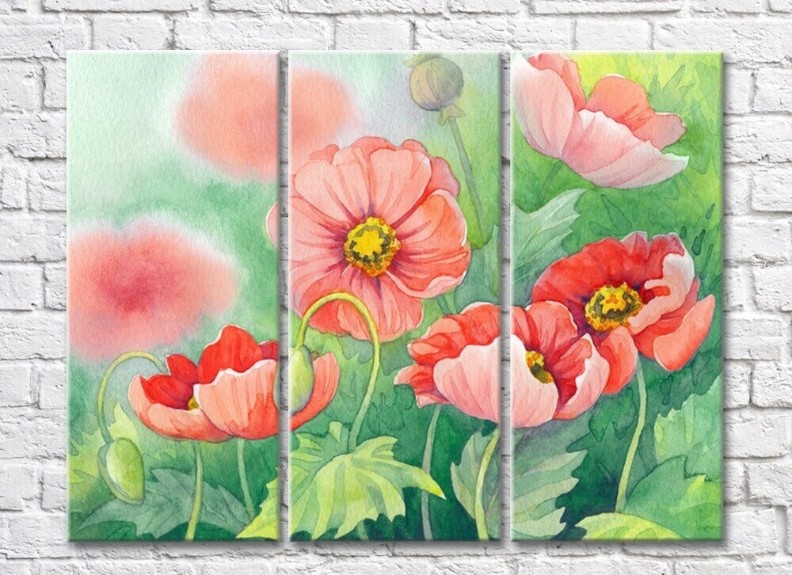 Картина Rainbow Large flowers of poppies on a green background watercolor (500387)