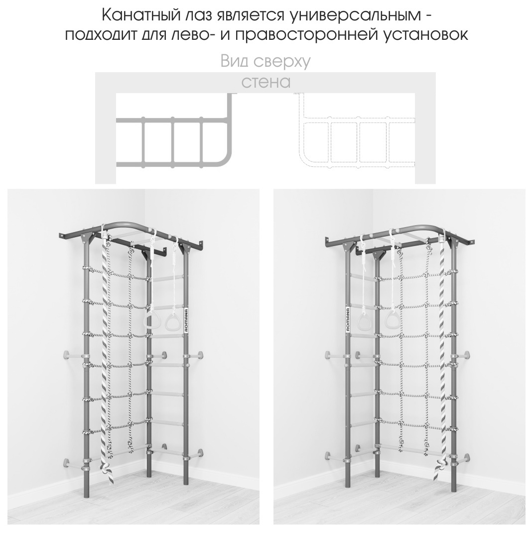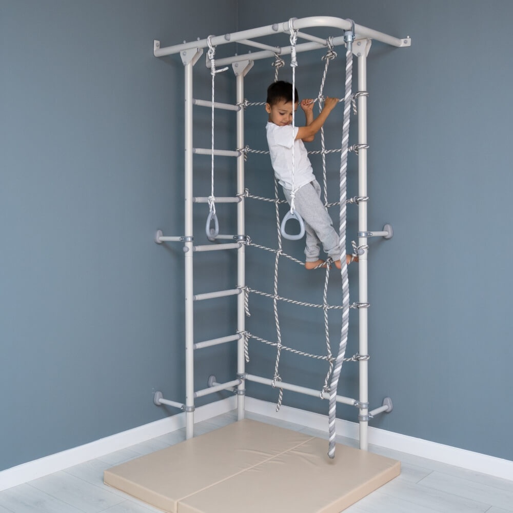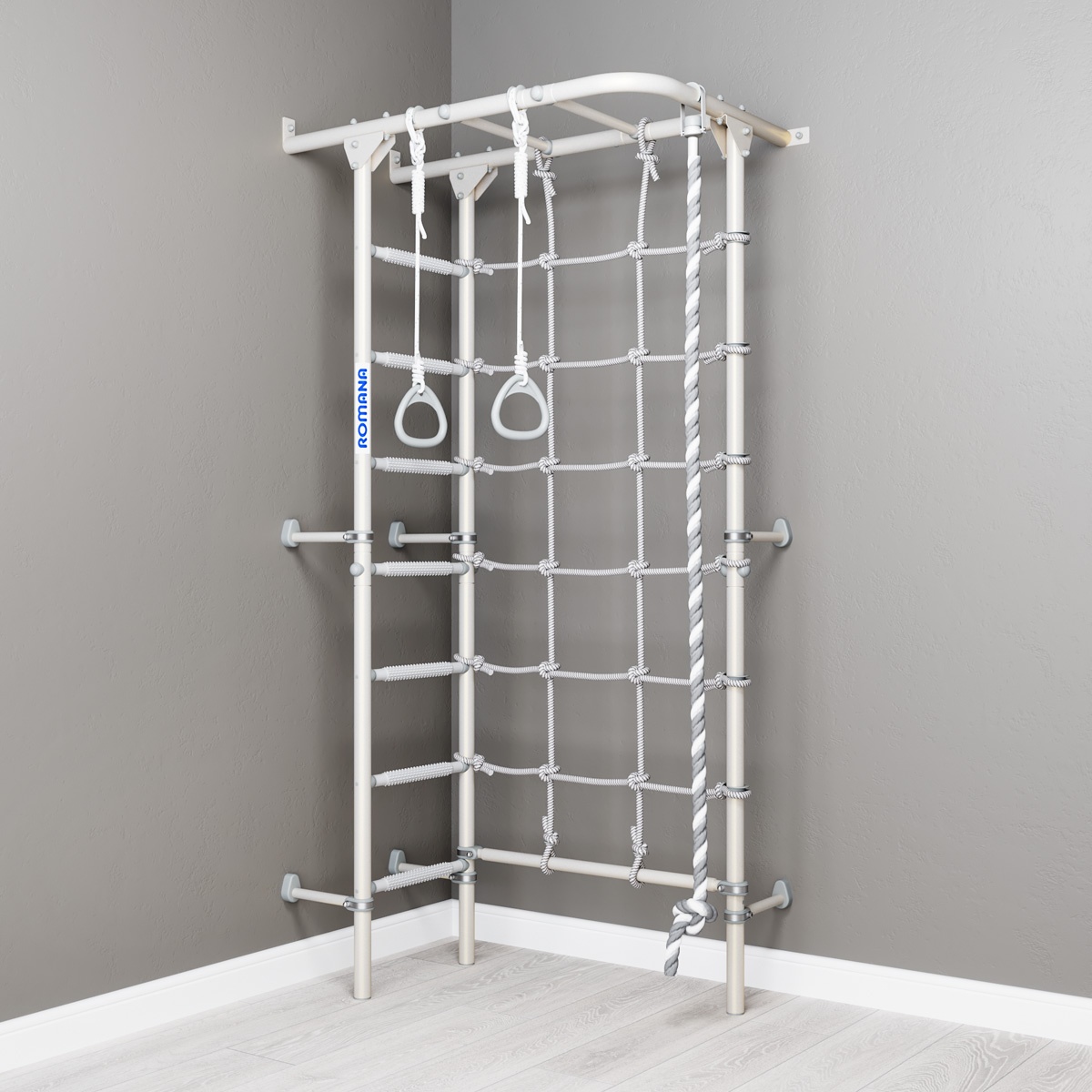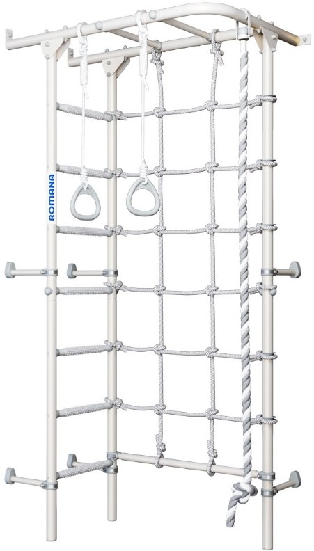 У детского спортивного комплекса ROMANA S4 оригинальная конструкция и расположение элементов. На рукоходе можно разместить разнообразное навесное оборудование. В комплекте предусмотрены канат, кольца и канатный лаз шириной 70 см из крепкого шнура. Конструкция выдерживает вес до 100 кг (нагрузка при испытаниях — 200 кг). Ступени лестницы обладают массажным эффектом, развивая мелкую моторику.