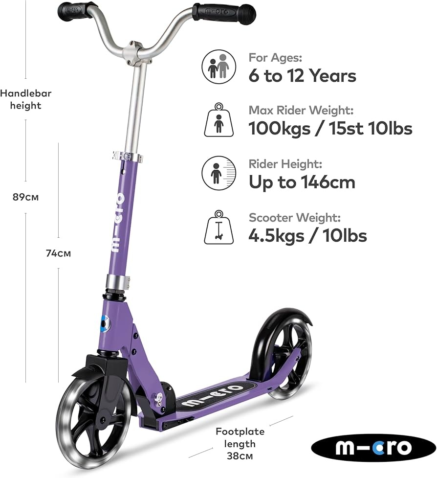 Самокат двухколёсный Micro Cruiser LED 200 из Швейцарии теперь со светящимися колёсами! – этот самокат подходит для комфортных прогулок, езде по городу. Он рассчитан на возраст от 5 до 10 лет и выдерживает вес до 100 кг. Эргономичная конструкция оптимальна для комфортного и длительного катания. Вес 4,5 кг. Самокат складной удобен при транспортировке и хранении. Микро Круизер имеет заниженную широкую платформу с подножкой, большие колёса 200 мм, с подшипниками класса АВЕС 9, которые позволяют разгоняться с минимальными усилиями. V образный широкий руль обеспечивает идеальный контроль самоката, уверенное управление и дополнительный баланс.