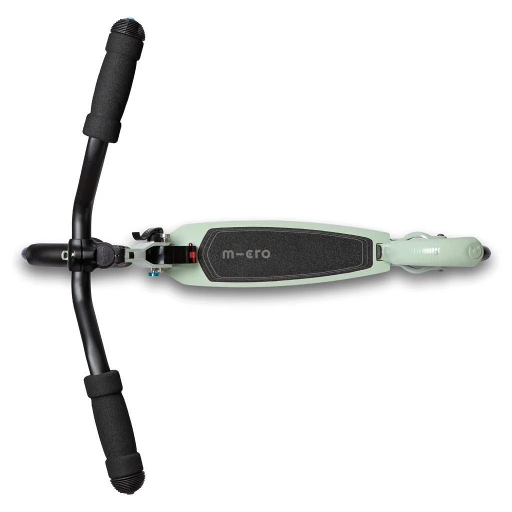 Micro Speed Deluxe имеет колеса диаметром 180 мм, которые обеспечивают комфортную езду. Переднее колесо имеет брызговики, такую же роль выполняет задний тормоз. Руль выполнен в стиле ретро для лучшего баланса пользователя. Гораздо легче сохранять равновесие на самокате, если держать руки врозь. Также повороты проходят легче и без потери устойчивости. Руль регулируется в диапазоне от 780 до 1030 мм.