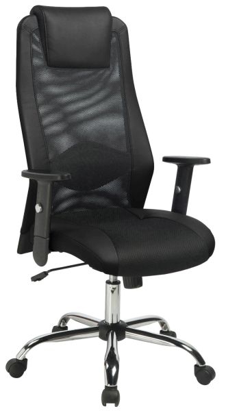 Удобное, современное кресло с синхронным механизмом, позволяющим фиксировать спинку в разных положениях. Комфортная сетчатая спинка с кожанными вставками красного цвета, хромированная база, регулируемые по высоте подлокотники. Поддержка поясницы. Кресло на роликах со средней спинкой. Кресло выполнено из искусственной кожи и сеточки черного цвета. Высота кресла регулируется с помощью газлифта. Механизм качания с регулировкой мягкости качания и с фиксацией кресла в наклонном положении. Подлокотники регулируются по высоте. Металлическая хромированная крестовина (база). Максимальная нагрузка - 120кг.