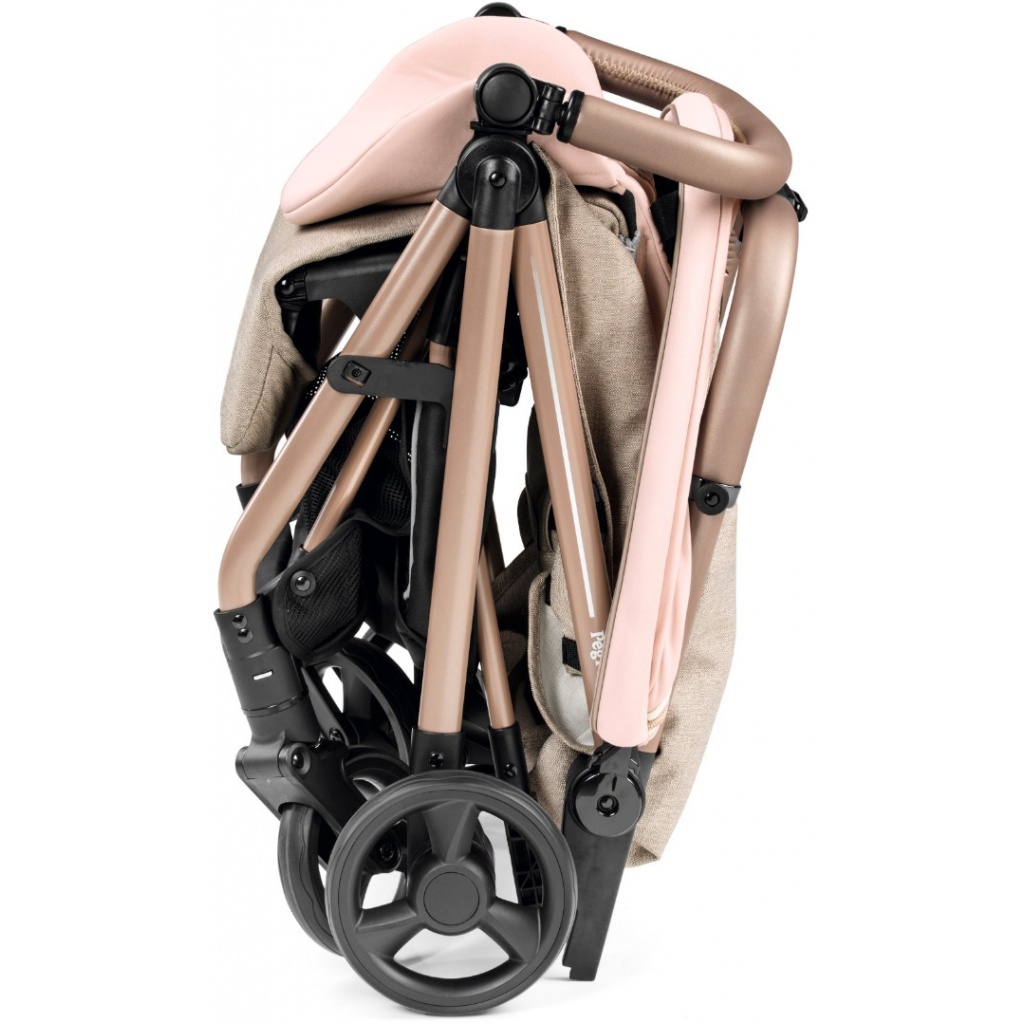 Вещевая корзина Peg Perego Selfie Plus не обладает какими-то невероятными размерами, но в нее поместится все необходимое на прогулке с ребёнком. Удобный тормоз расположен на задней перекладине – он не испачкает вашу обувь. Сложить коляску одной рукой совсем несложно! Нажмите на кнопку на ручке и коляска автоматически сложится книжкой. В таком виде ее можно переносить, словно чемодан, держа за бампер.
