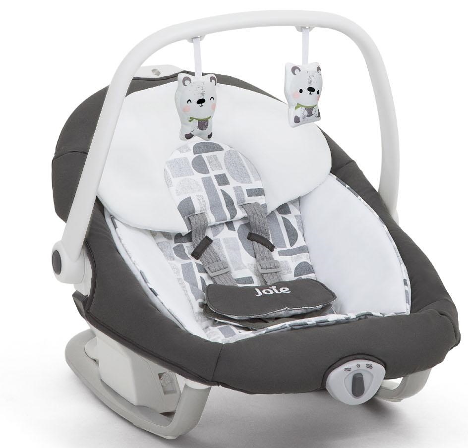 Мягкий и уютный шезлонг Serina Tile имеет анатомическую форму, что очень важно для правильного развития спинки. Чтобы кроха не выпал, ворочаясь во сне или играя, предусмотрены пятиточечные ремни безопасности. Сиденье имеет форму ракушки с закругленными краями, чтобы ребенок не поранился. Вы можете регулировать наклон в 3 различных положениях, включая горизонтальное для сна. Сиденье Joie Serina 2 в 1 устанавливается как боком, так и спиной к основе, от чего зависит траектория его движения (справа налево, или вперед-назад). Для детишек разного возраста предусмотрено 6 скоростей качания и 2 скорости вибрации (для работы вибромодуля нужна батарейка). Для развлечения малыша, а также для развития его визуальных, тактильных и слуховых способностей, над люлькой крепится вращающаяся дуга с игрушками и есть функция музыкального сопровождения (5 колыбельных мелодий и 5 природных композиций). Металлический каркас Joie Serina 2 в 1 легкий и устойчивый. Чтобы качели было удобно перемещать по квартире, есть встроенная ручка и два маленьких колесика в основании.