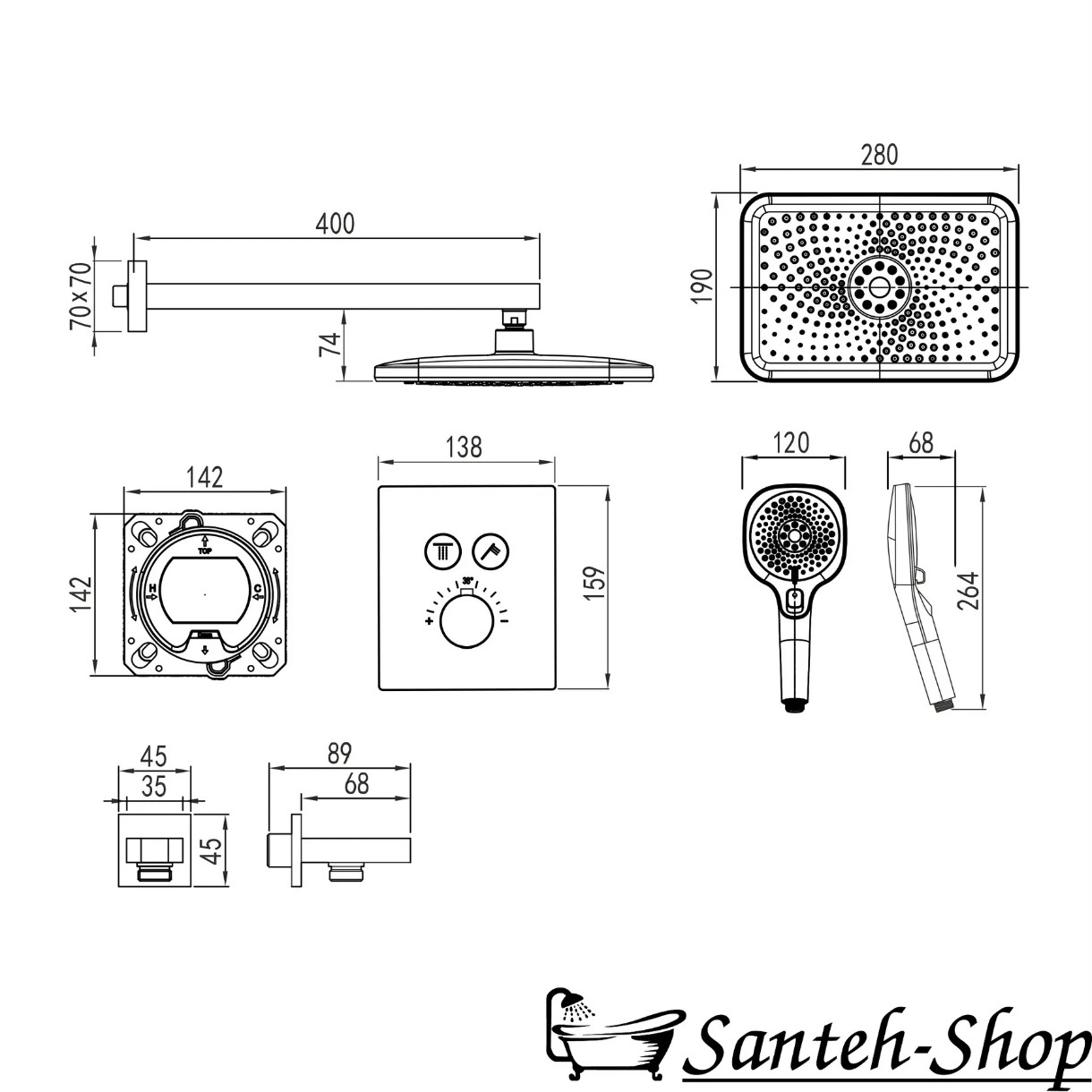 Форма верхнего душапрямоугольная