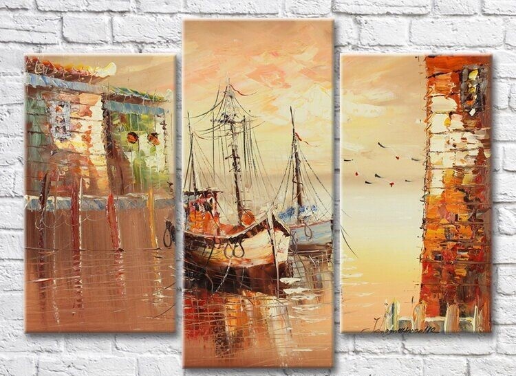 Картина Rainbow Two fishing boats at sunset by the pier (3485213)