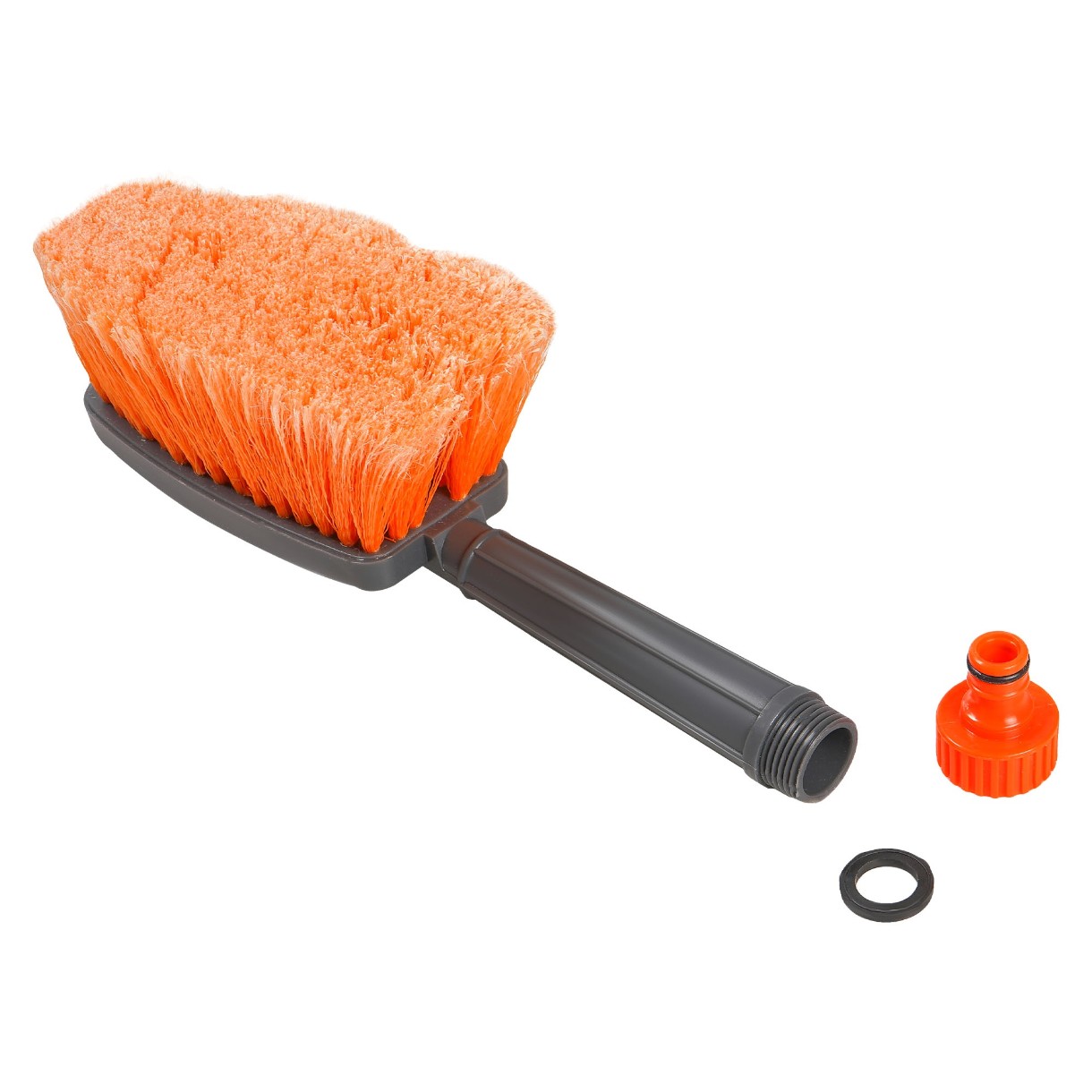 Компактная пластиковая щетка серого цвета для мытья автомобиля поможет очистить машину от загрязнений. Диаметр щетины щетки составляет 0,3 мм и имеет мягкие распушенные кончики. Рабочая поверхность изделия имеет ворс средней длины, а также оранжевую окраску. Со стороны ручки у изделия расположена насадка для подключения шланга с водой.