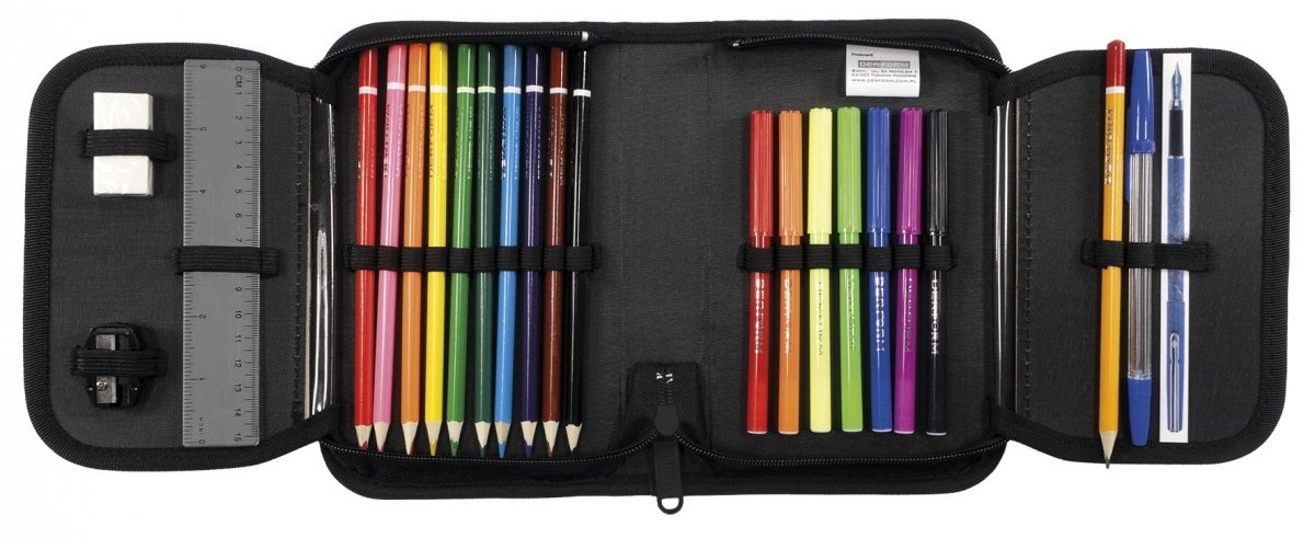 В его комплектацию входит: 10 цветных карандашей, карандаш, точилка, ластик, 7 маркеров, линейка и ручка.