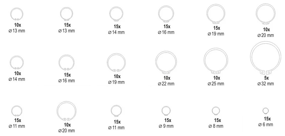 -Внутренние стопорные кольца x70 (Ø11 мм x15, Ø13 мм x10, Ø14 мм x10, Ø16 мм x15, Ø19 мм x10, Ø20 мм x10)