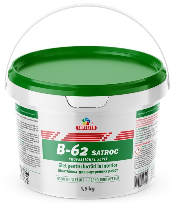 B-62 ȘATROC — высококачественная шпатлевочная масса для внутренних работ. Используется для финишной и профессиональной подготовки поверхностей для различных видов отделочных работ (окраска, декоративная отделка мраморными пластерами, веницианской штукатуркой и др.).