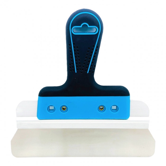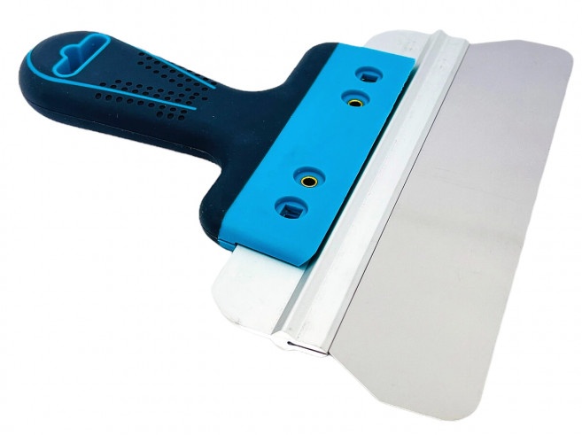 Рабочая часть шпателя изготовлена из кислотостойкой нержавеющей стали, толщина которой 0,5 мм, и встроена в анодированный алюминиевый профиль для усиления и обеспечения идеально прямой рабочей кромки. Эргономичная контурная двухкомпонентная ручка обеспечивает удобство работы. Для отделочных и строительных работ.