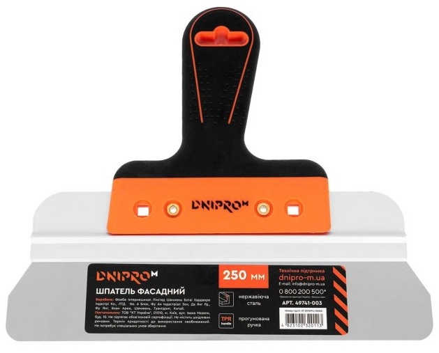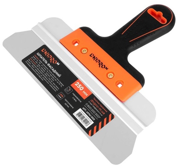 Предназначением фасадного шпателя DNIPRO-M является широкий спектр фасадных работ. Его широкая рабочая часть (250 мм) выполнена из нержавеющей стали.