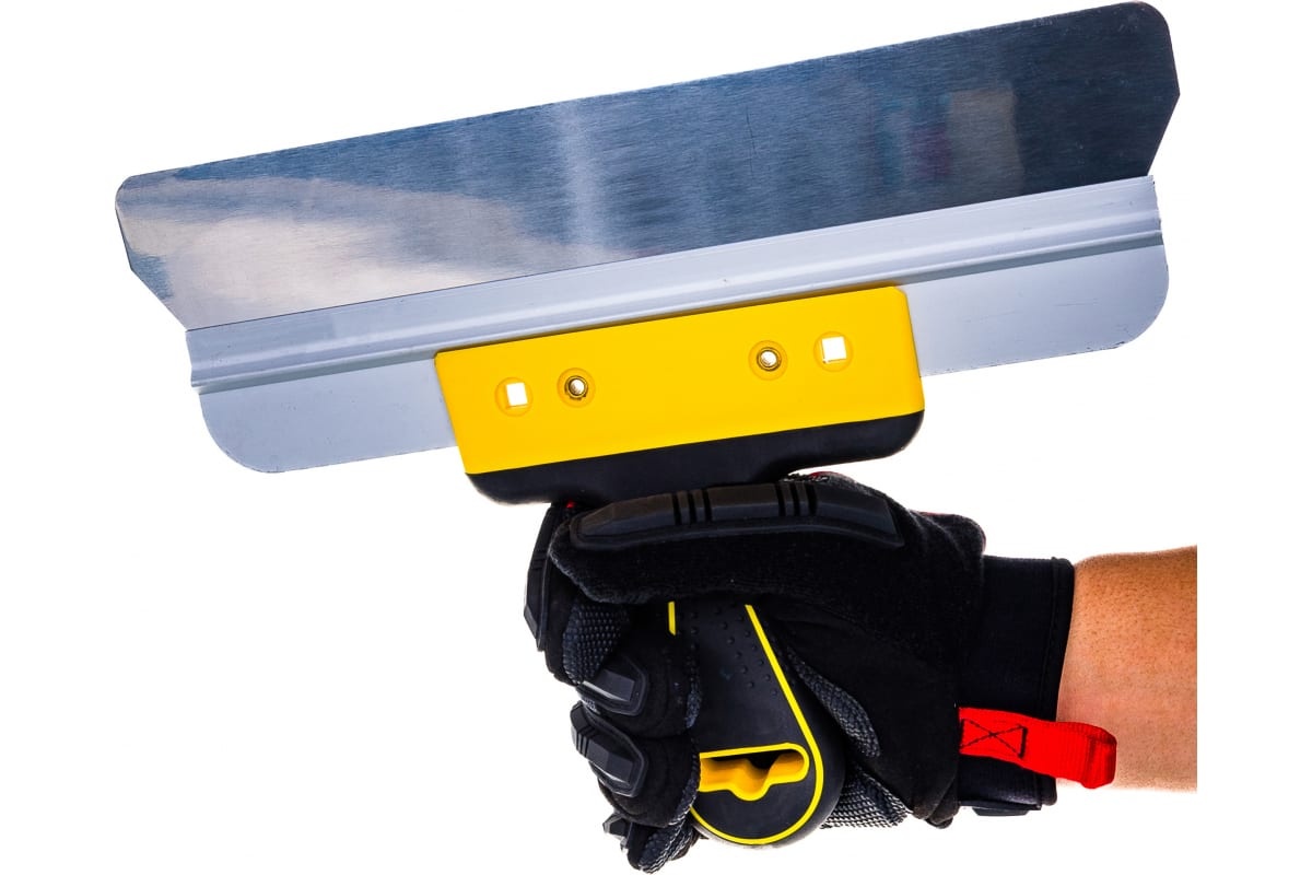 Применяется для нанесения, выравнивания и сглаживания шпаклевочного слоя и других отделочных растворов на больших и малых поверхностях. Выбор ширины полотна зависит от площади обрабатываемой поверхности. Сразу после использования шпатель нужно очистить водой, затем протереть насухо.
