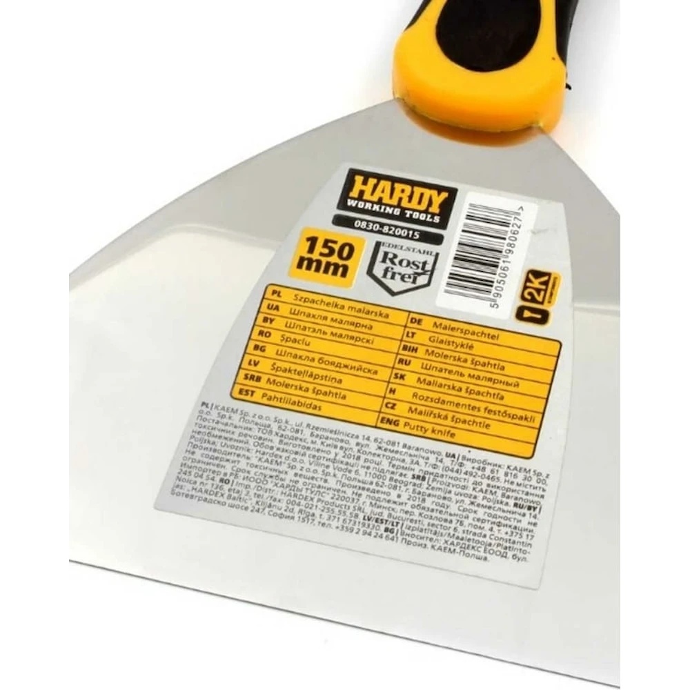 Шпатель HARDY малярный 150мм серия 82 нержавеющая сталь ручка 2K 0830-820015 широко используется для ремонтных и строительных работ. Пружинистая, полированная нержавеющая сталь, устойчивая к коррозии. Ударопрочная двухкомпонентная ручка с отверстием для подвешивания и удобного хранения обеспечивает максимально удобную работу.