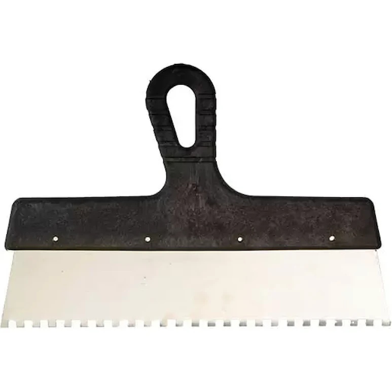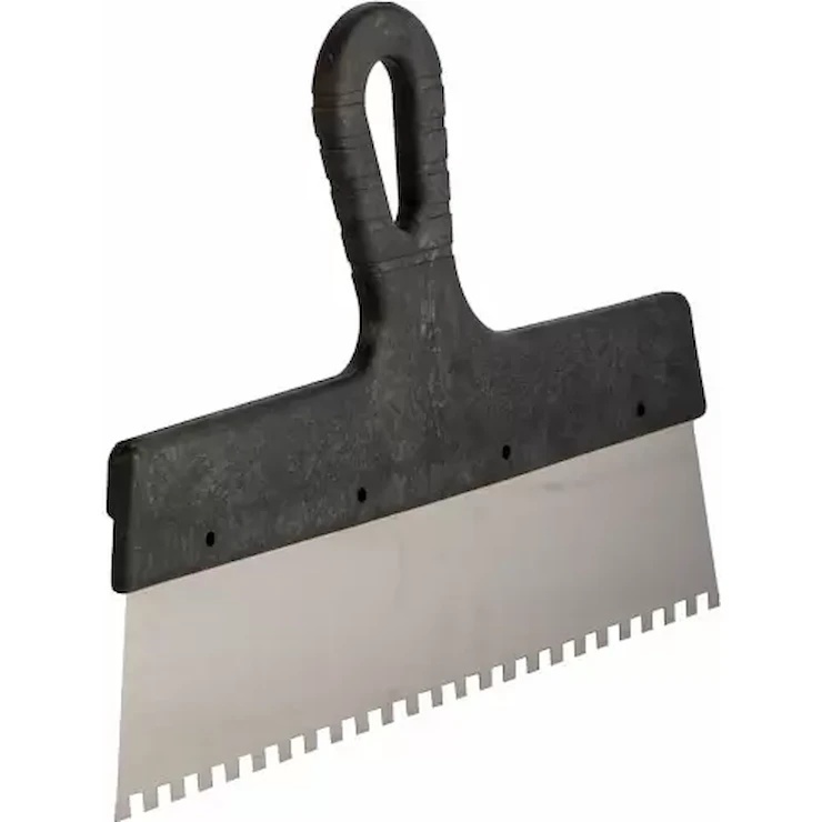 Шпатель для клея Profmet и ручкой из пластика — это специализированный инструмент, предназначенный для равномерного нанесения клеевых смесей при укладке плитки, ламината и других напольных и стеновых покрытий. Зубчатая структура лезвия обеспечивает идеальное распределение клея, создавая оптимальный рисунок для надежного сцепления материалов. Пластиковая ручка делает инструмент легким и удобным в работе, минимизируя усталость во время длительного использования.