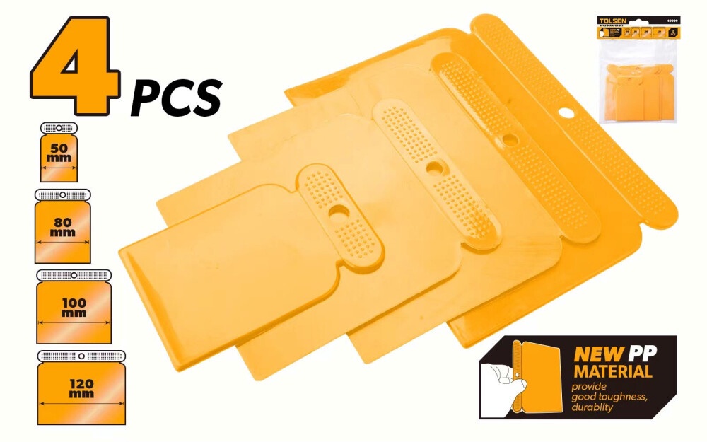 Набор шпателей Tolsen идеально подходят для любых ремонтных и строительных работ, обеспечивая каждый раз профессиональный и точный результат. В комплект входят четыре шпателя разных размеров: 50 мм, 80 мм, 100 мм и 120 мм, которые удовлетворят все ваши потребности в затирке швов и очистке поверхностей. Изготовленные из нового материала ПП (полипропилен), эти шпатели обладают высокой прочностью и долговечностью, что гарантирует отсутствие повреждения рабочей поверхности.