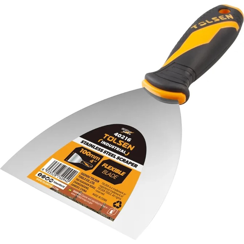 Tolsen 40216 — это артикул для шпателя промышленного класса (Industrial Putty Knife) шириной 100 мм, предназначенного для отделочных и малярных работ.