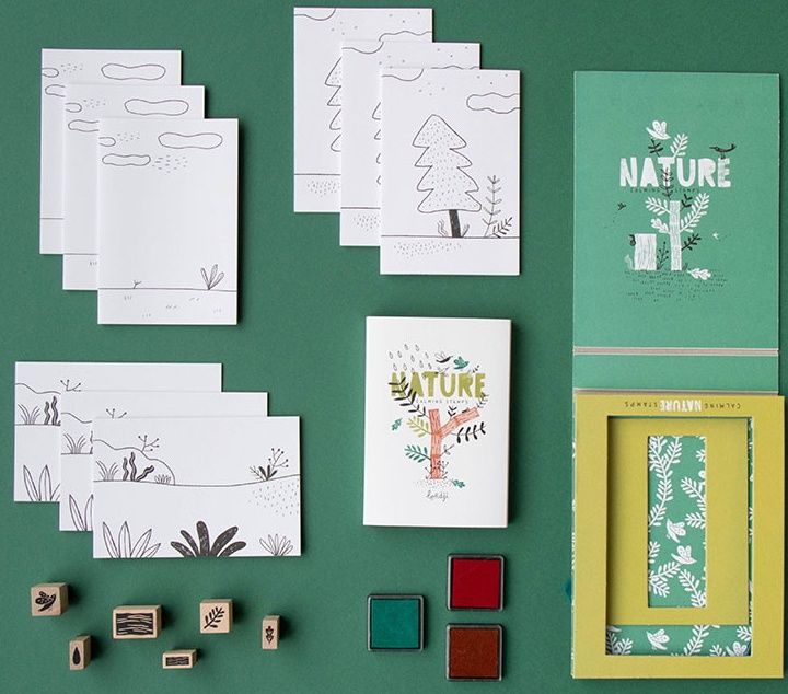 Комплектация6 деревянных штампов, 9 раскладных листов, чернила 3-х цветов