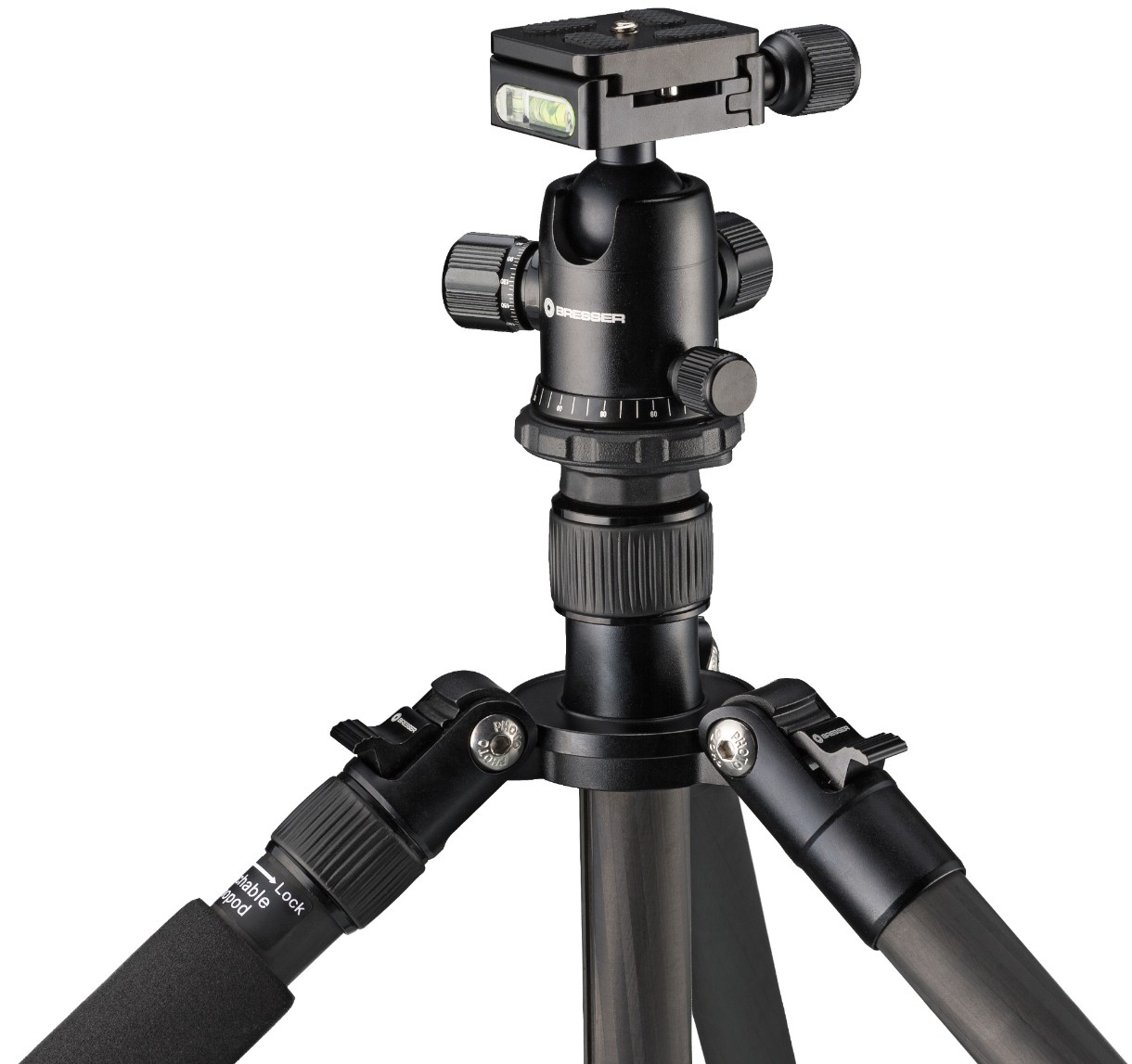 Ножки можно регулировать по отдельности в трех разных положениях. Одну ногу можно снять и использовать как монопод, прикрепив к ней шаровую головку. Этот стенд поставляется с полностью алюминиевой шаровой головкой BRESSER B-1, которая вращается на 360 градусов и может быть наклонена под любым углом, включая положение стоя. Быстросъемную пластину, совместимую с Arca Swiss, можно прикрепить к камере или устройству просмотра, чтобы обеспечить надежное соединение с шаровой головкой B-1. Вращающееся кольцо прикреплено к основанию шаровой головки и позволяет камере поворачиваться без наблюдателя, сохраняя при этом ту же высоту и уровень, что делает ее идеальной для панорамной съемки.