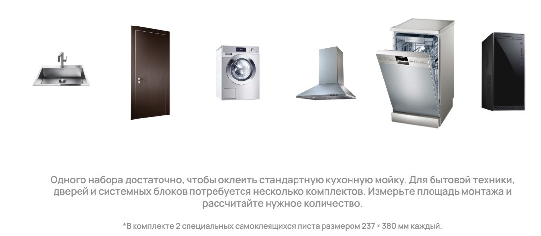 Одного набора достаточно, чтобы оклеить стандартную кухонную мойку. Для бытовой техники, дверей и системных блоков потребуется несколько комплектов. Измерьте площадь монтажа и рассчитайте нужное количество.