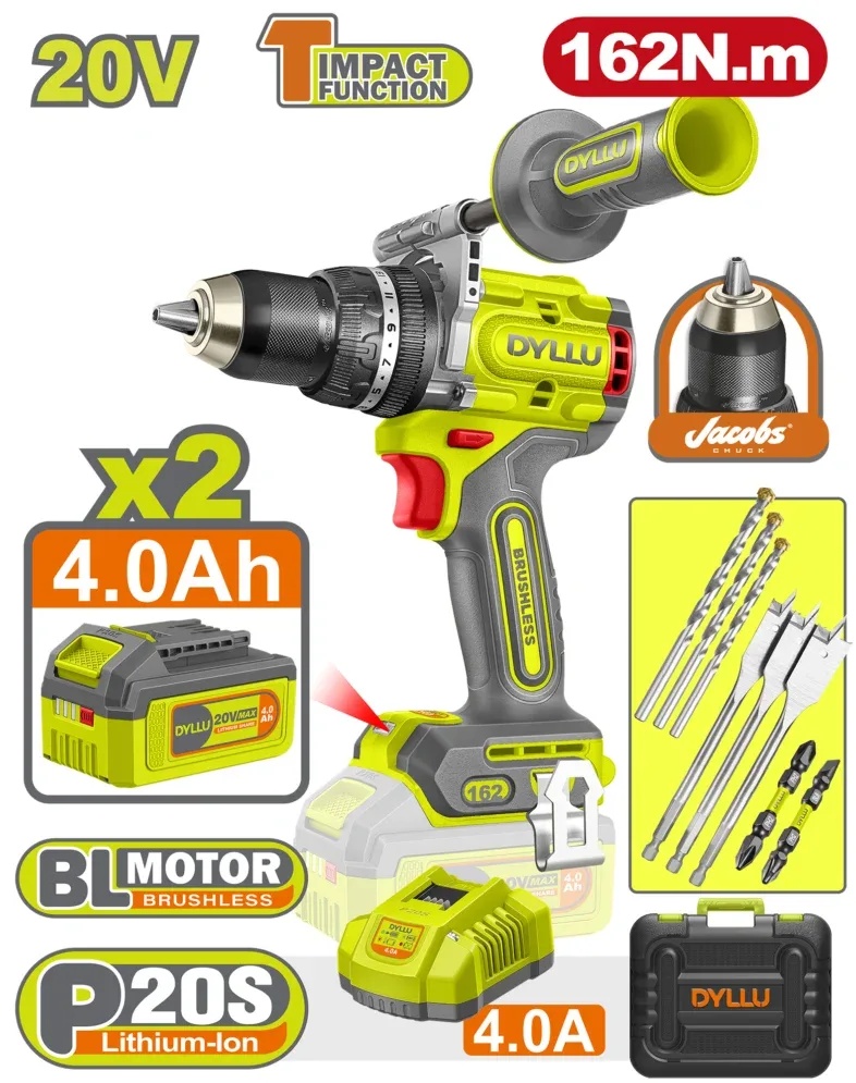 Мощный бесщеточный шуруповерт Dyllu DTCDP16281 с крутящим моментом 162 Нм предназначен для самых сложных профессиональных задач по сверлению и крепежу. Инструмент оснащен надежным металлическим патроном Jacobs, двухскоростным редуктором и функцией ударного сверления для работы с бетоном и кирпичом. Эргономичный дизайн в сочетании с 20-вольтовой аккумуляторной системой обеспечивает высокую автономность и комфорт при длительной эксплуатации.