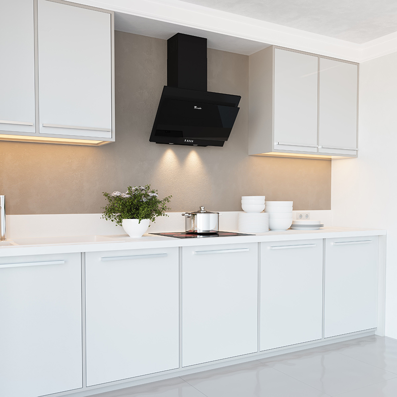 Фасад выполнен из закаленного стекла, что придает кухне стильный вид и облегчает уход за вытяжкой,