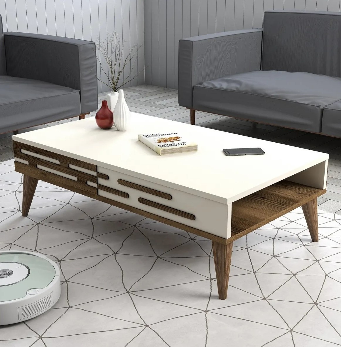 Столик превращает пространство в комфортное и приветливое место, подходящее как для встреч с близкими, так и для спокойного отдыха с чашкой кофе.