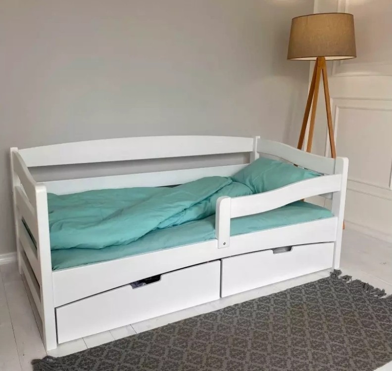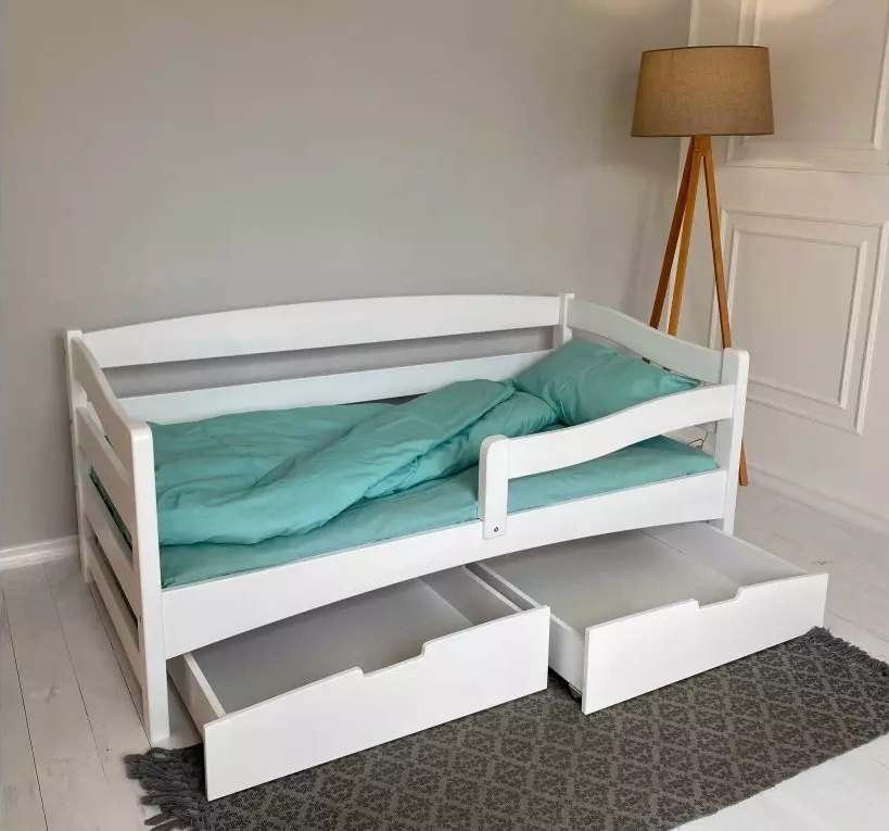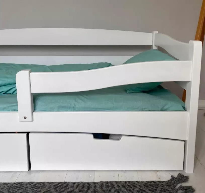 Кровать покрыта краской на водяной основе. Наличие вместительных ящиков на колесах, для удобства хранения вещей.