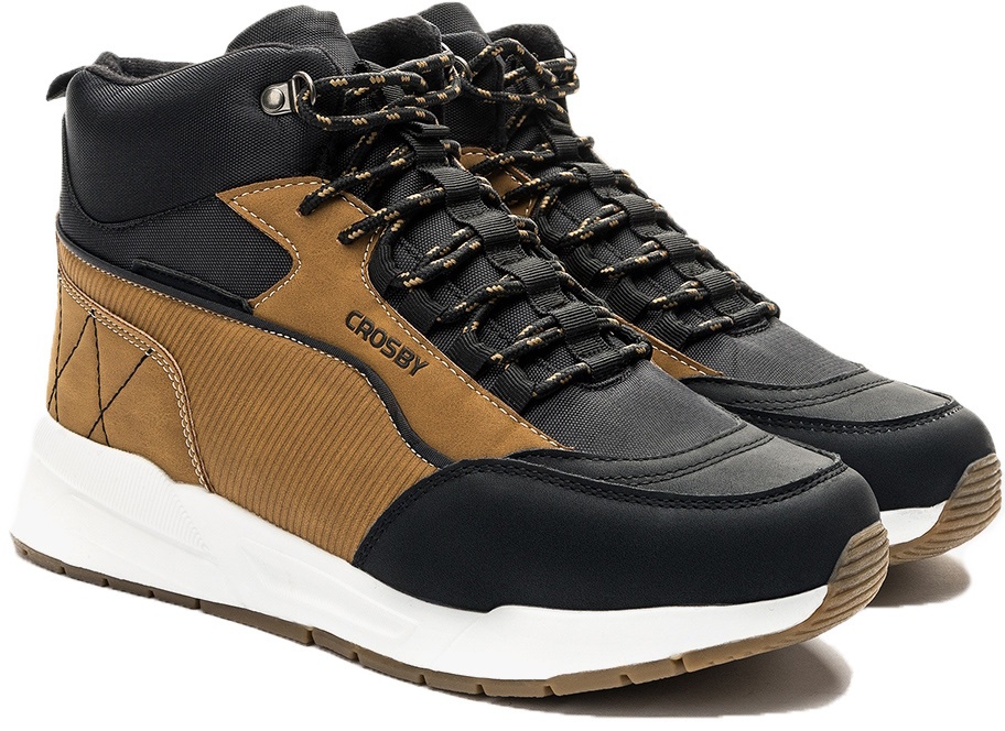 Комфортные зимние ботинки выполнены из плотного черного текстиля и высокотехнологичной кожи модного оттенка кэмел и универсального черного цвета. Модель украшена логотипами CROSBY на пятке и боковой панели и объемной двухцветной шнуровкой. Подкладка и стелька из натуральной шерсти надежно сохраняют тепло. Эластичная подошва с амортизацией снимает нагрузку со стопы в течение дня.