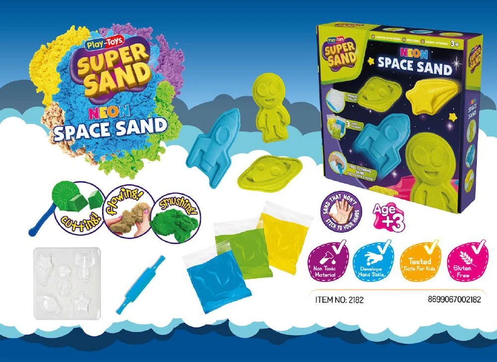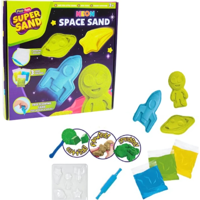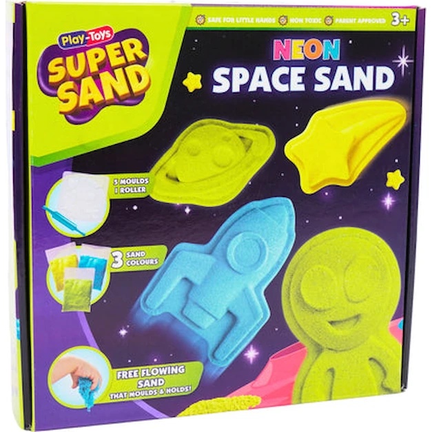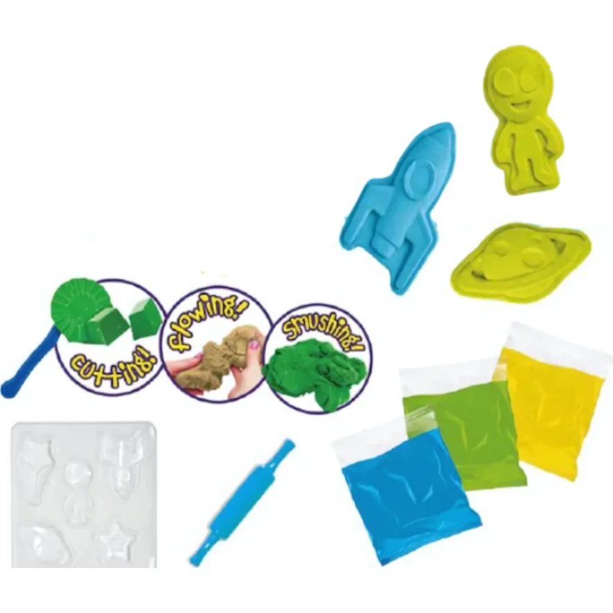 В комплект входит неоновый песок ярких оттенков, а также формочки для лепки ракет, звёзд и астронавтов. Песок мягкий и легко формуется, обеспечивая часы сенсорной игры и способствуя развитию ручных навыков.