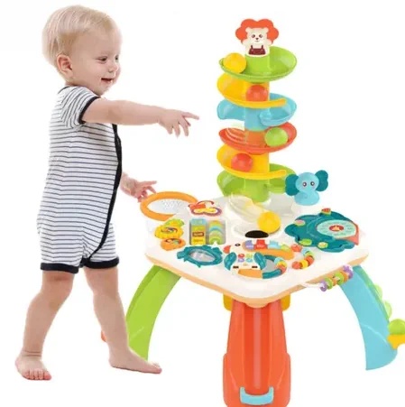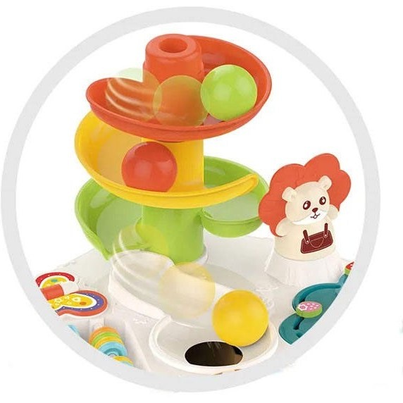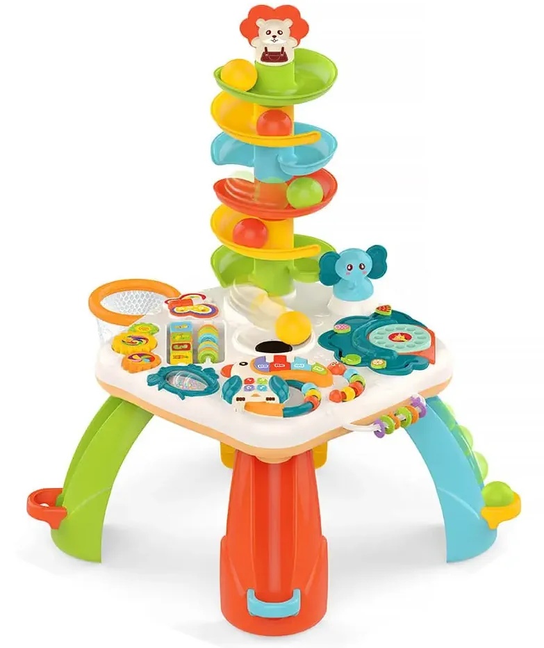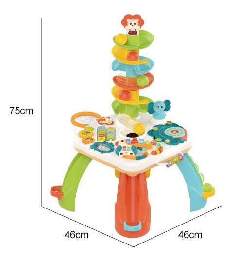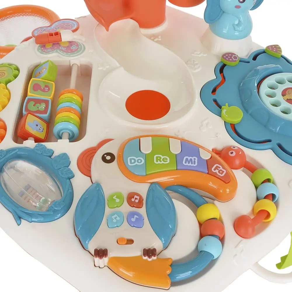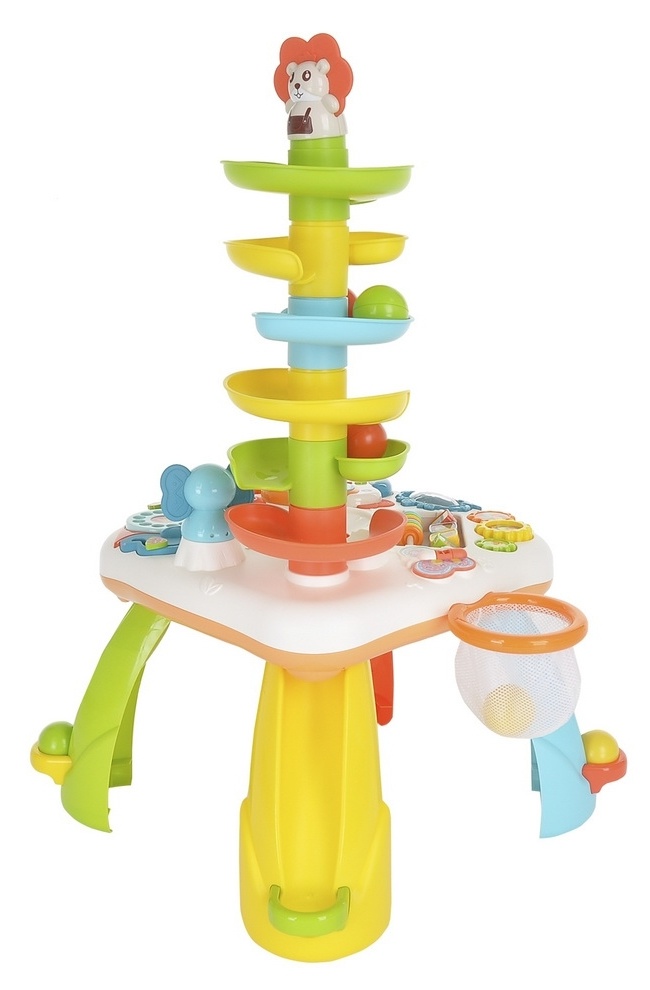Столик оснащен музыкальной панелью с функциональными кнопками, пианино с цветными клавишами, телефоном, желобом с шариками, баскетбольной корзиной и другими подвижными элементами. Некоторые из них можно снять и играть ими отдельно.
