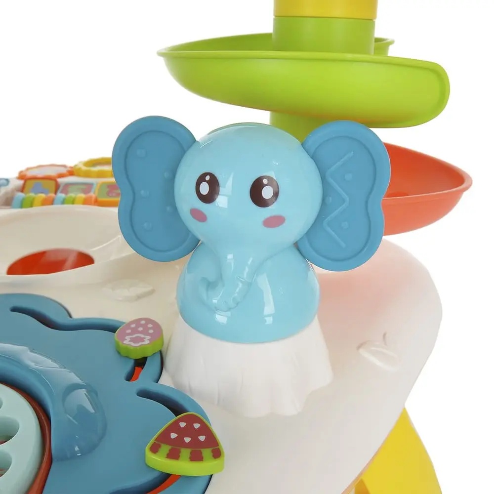 Развивающий столик Huanger HE0519 «Занимательный слоник» предназначен для развития у детей мелкой моторики рук, координации движений и памяти. Также дети познакомятся во время игры со звуками животных, звучанием нот и научатся распознавать цвета.