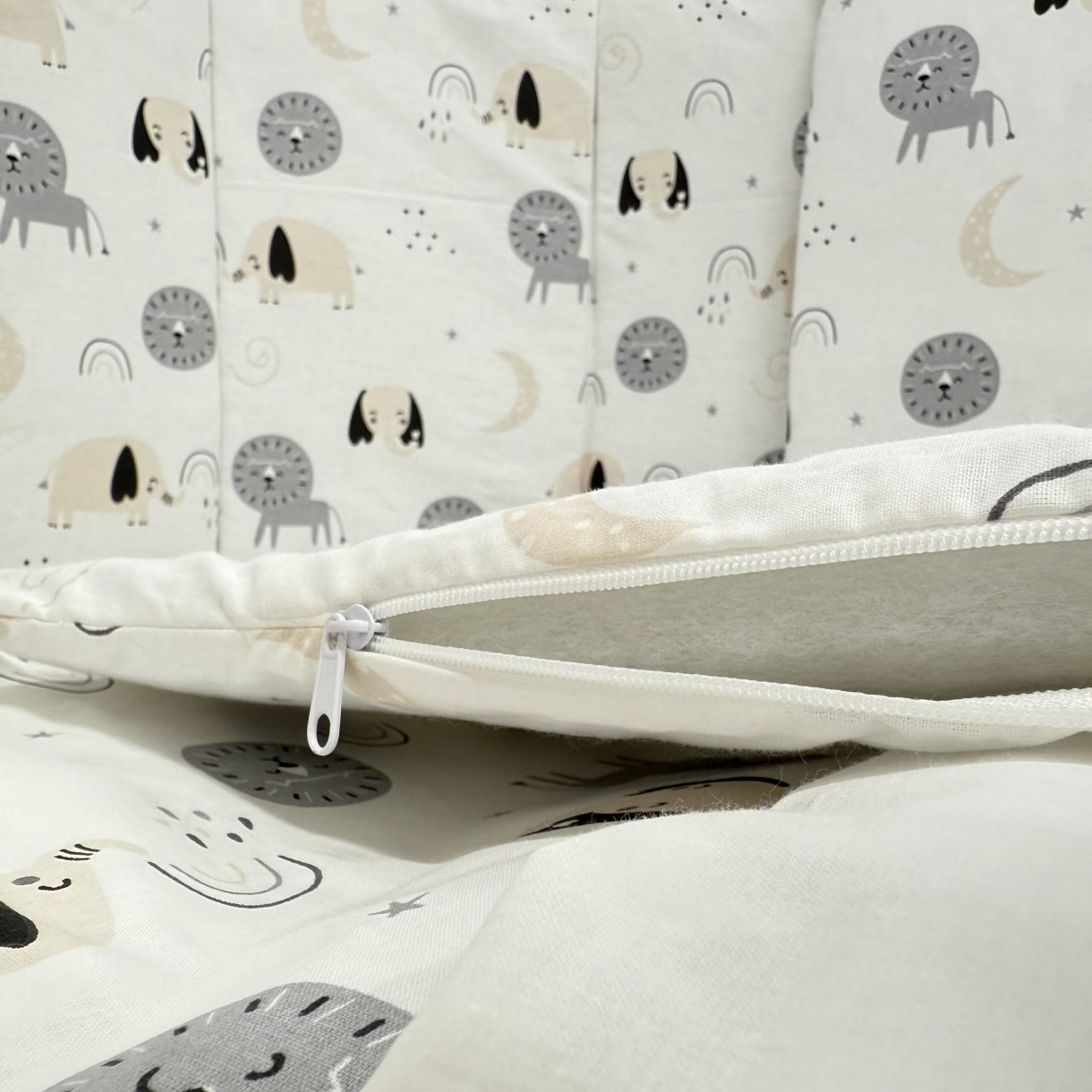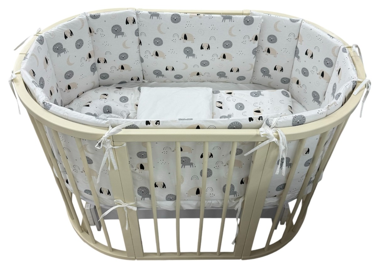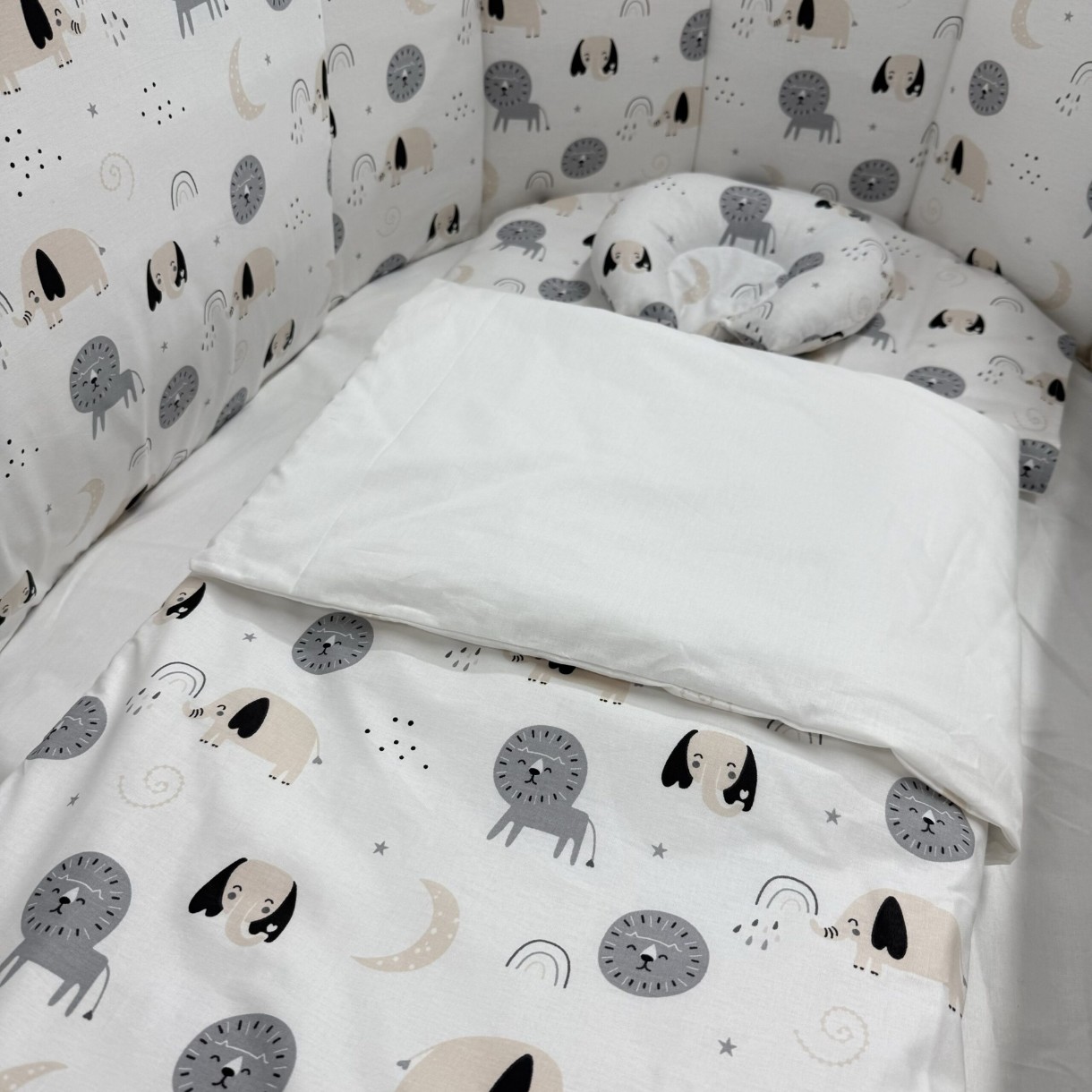Милый и комфортный комплект постельных принадлежностей для детской кроватки. Нежный и легкий комплект обеспечит спокойный и безопасный сон вашему ребенку.