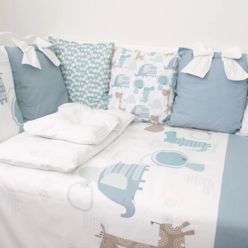 Простыня на резинке-такую простыню легко заправлять, она лучше и ровнее ложится на матрас. Не будет съеживаться, даже если спящий ворочается. А значит сон будет гораздо комфортнее, чем при использовании обычных простыней. Для дополнительного удобства бампер сделан из 12 подушек со съемным чехлом. Теперь вы можете стирать только внешнюю часть бампера, не затрагивая наполнитель. А внутри бампера — экологически чистый, гипоаллергенный и легкий материал. Он прекрасно сохраняет форму, не слеживается, даже когда малыш начинает активно передвигаться в кроватке.