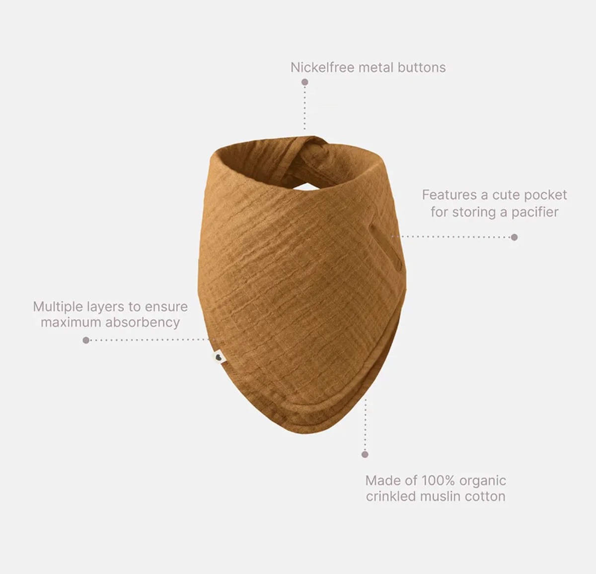 Слюнявчик BIBS Bandana Bib изготовлен из 100% органического хлопка (муслина), сертифицированного GOTS. Слюнявчик состоит из нескольких слоев для обеспечения максимальной впитываемости и может использоваться при слюноотделении и срыгивании после кормления. Муслиновый слюнявчик является стильным аксессуаром и его можно использовать как легкий шарфик в ветреную погоду. Кроме того, в нагруднике есть симпатичный карман, в который можно положить пустышку или небольшой платочек.