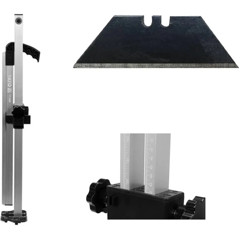 Двусторонний резак для гипсокартона YATO YT-76280. Головка подходит для резки досок толщиной 6, 9,5, 12,5 и 16 мм. На направляющих фрезы имеются миллиметровая и дюймовая шкалы.