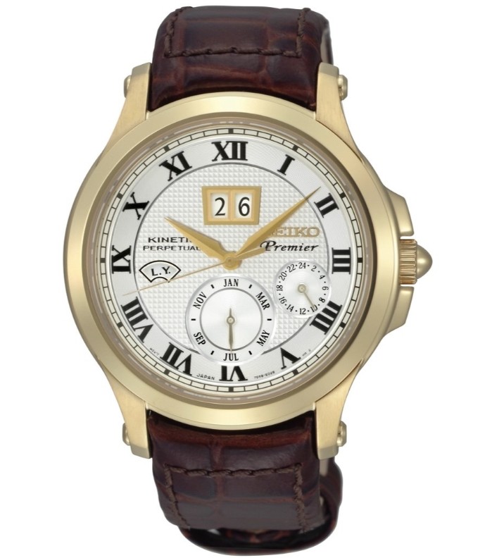 Seiko Premier SNP044P1 - мужские кварцевые часы. Корпус этих часов среднего размера (41 мм.) и выполнен из нержавеющей стали с золотом. Модель Premier SNP044P1 имеет сапфировое стекло, кожаный ремешок коричневого цвета, белый циферблат. Водоустойчивость: 100 метров. Дополнительные функции и особенности: дата, вечный календарь.