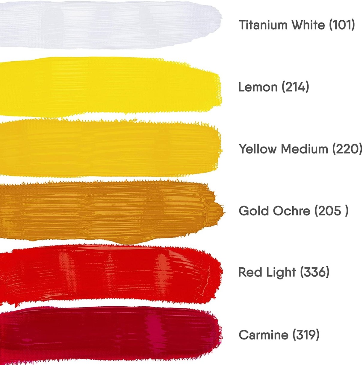 Белила титановые Лимонная Желтая средняя Охра золотистая Красная светлая Карминовая Зеленая светлая