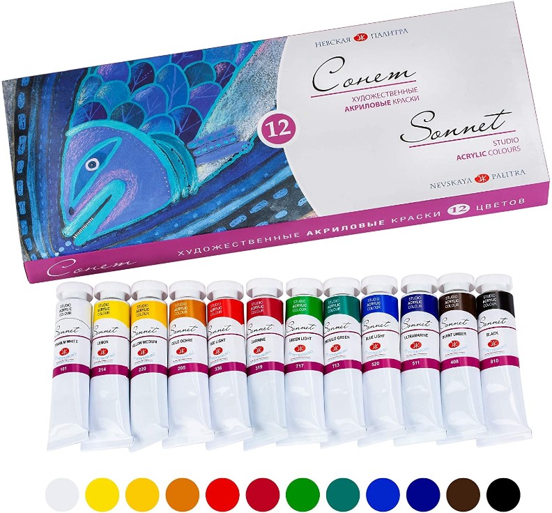 Художественные акриловые краски «Сонет» — качественный и доступный по цене материал для начинающих художников. Акрил «Сонет» предназначен для живописи и