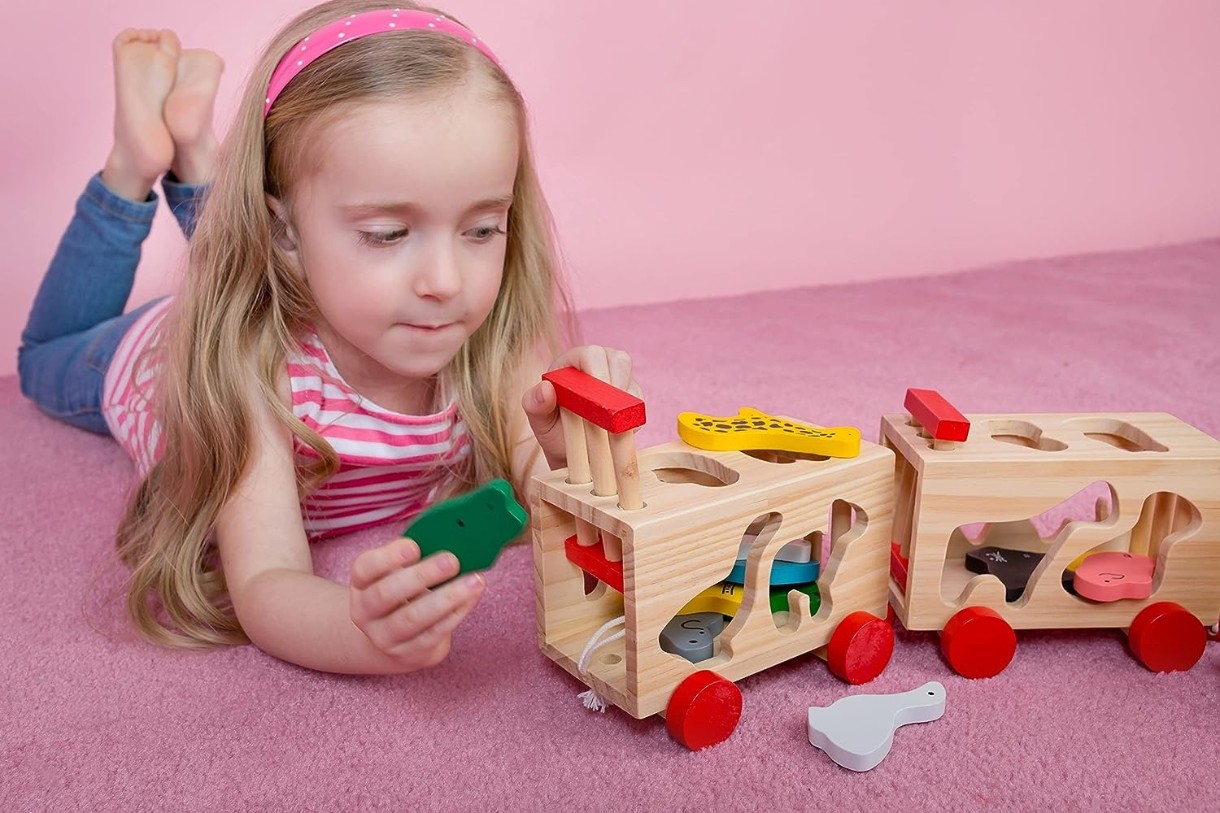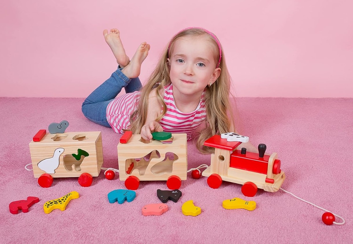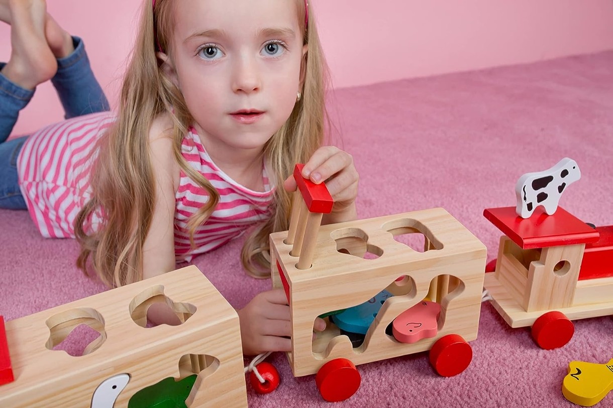Деревянный набор для перевозки с функцией сортировки по форме для вставки разноцветных деревянных животных в отверстия одинаковой формы в вагонах.