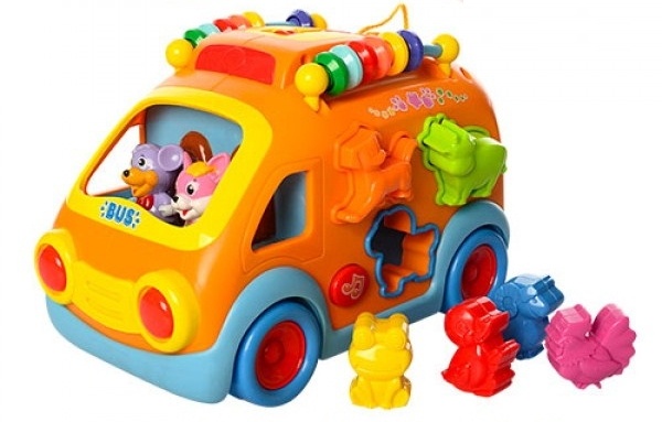 Автобус-сортер, длина 23 см, ездит, водители-животные танцуют, светятся фары, автобус поет песню на английском языке.