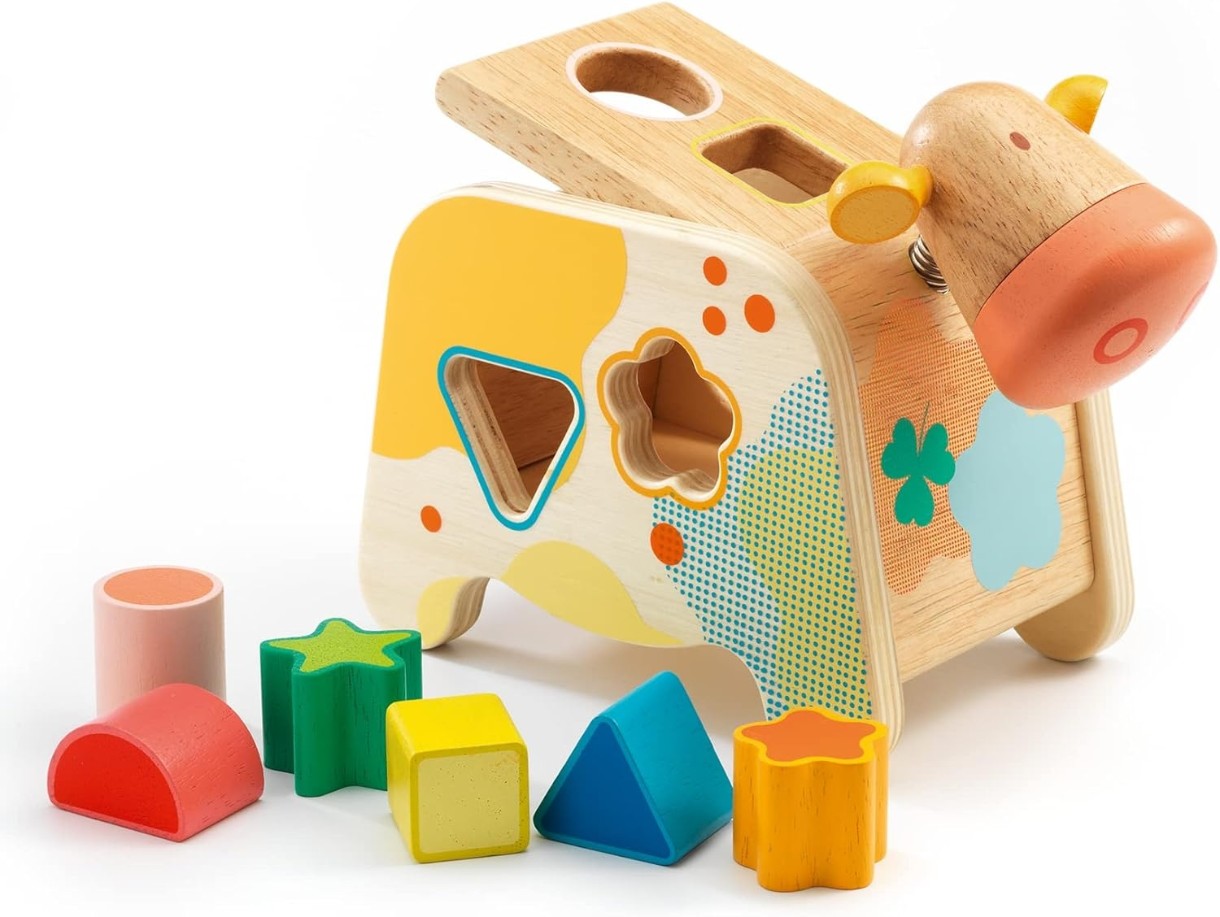 «Коровка» - это необычная развивающая игрушка-сортер, выполненная в виде объемной фигуры коровы, на боках и спине которой имеются отверстия разной формы. Дополнительно в комплект входят шесть деревянных геометрических фигур (треугольник, квадрат, круг, полукруг, цветочек и звездочка). Малышам нужно последовательно поместить все фигуры внутрь коровки, используя соответствующее отверстие. Дополнительным плюсом данной конструкции является пружинное крепление головы коровки, что позволяет малышам развивать мелкую моторику рук и просто весело проводить время.
