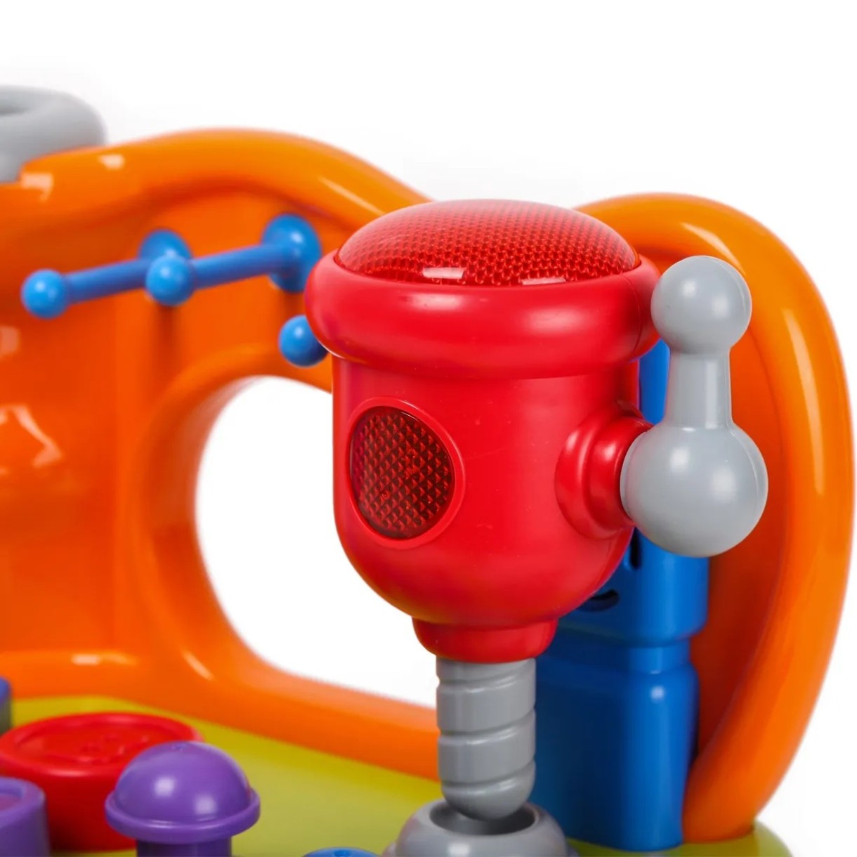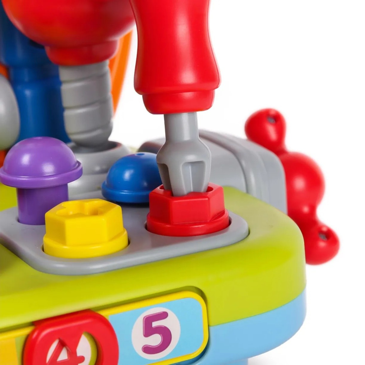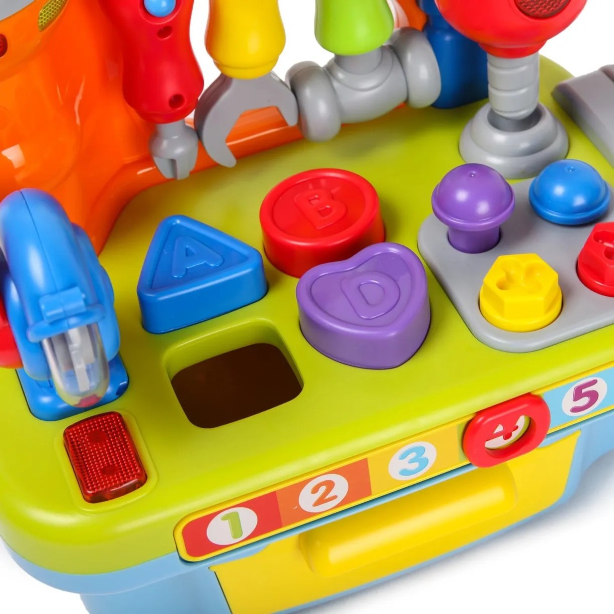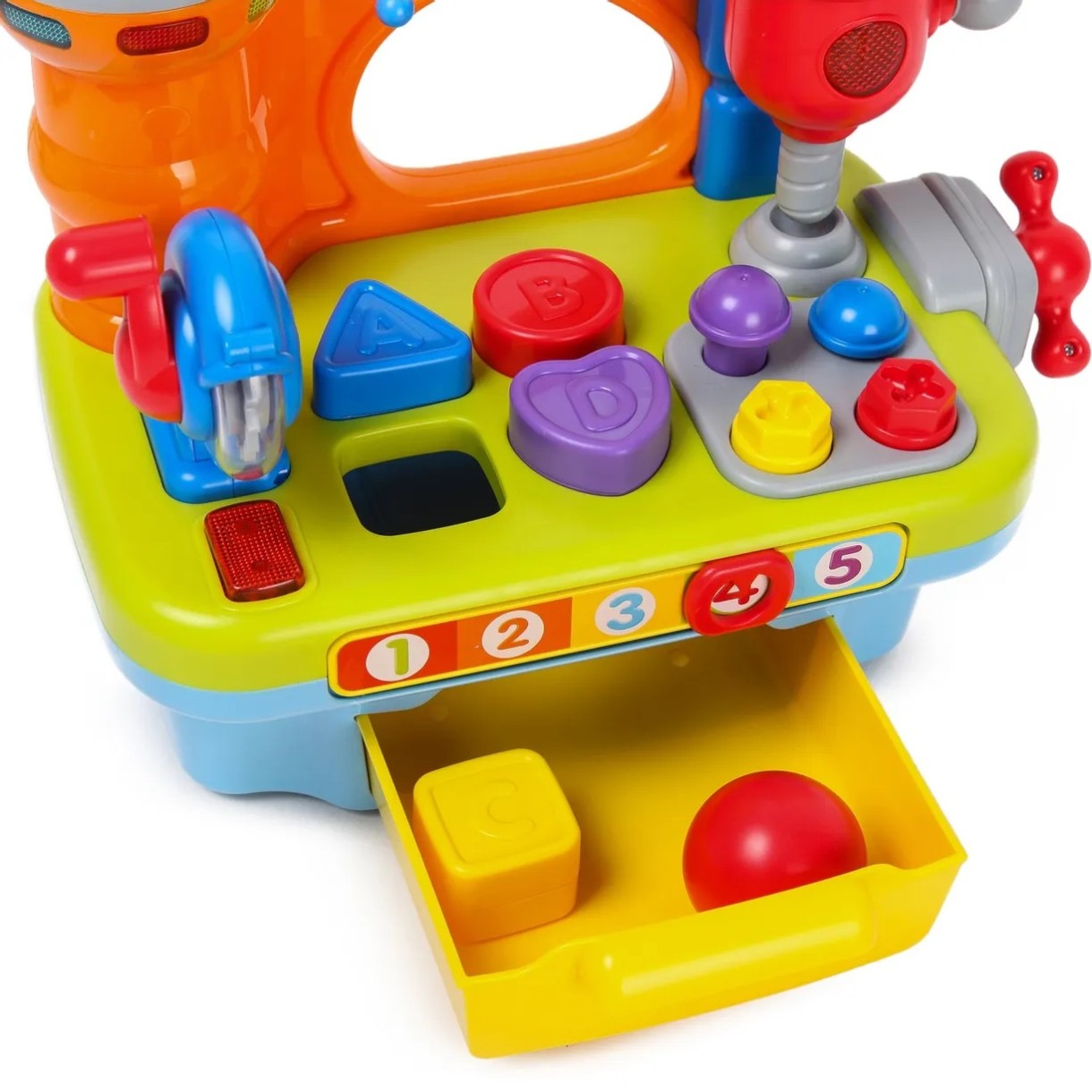 Также на игрушке установлена цифровая шкала, с помощью которой легко научиться считать. Ящичек открывается, что позволяет сложить внутрь мелкие игрушки. Все детали окрашены в яркие цвета, которые привлекут малыша.