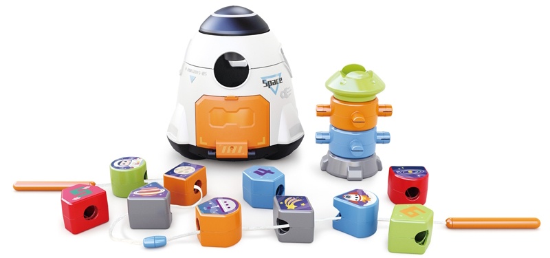 Вторая игра, Lacing Beads, развивает координацию рук и глаз, поскольку дети нанизывают геометрические блоки вдоль отверстий, используя прилагаемый шнурок. Эта игра также учит сортировке форм и распознаванию цветов.