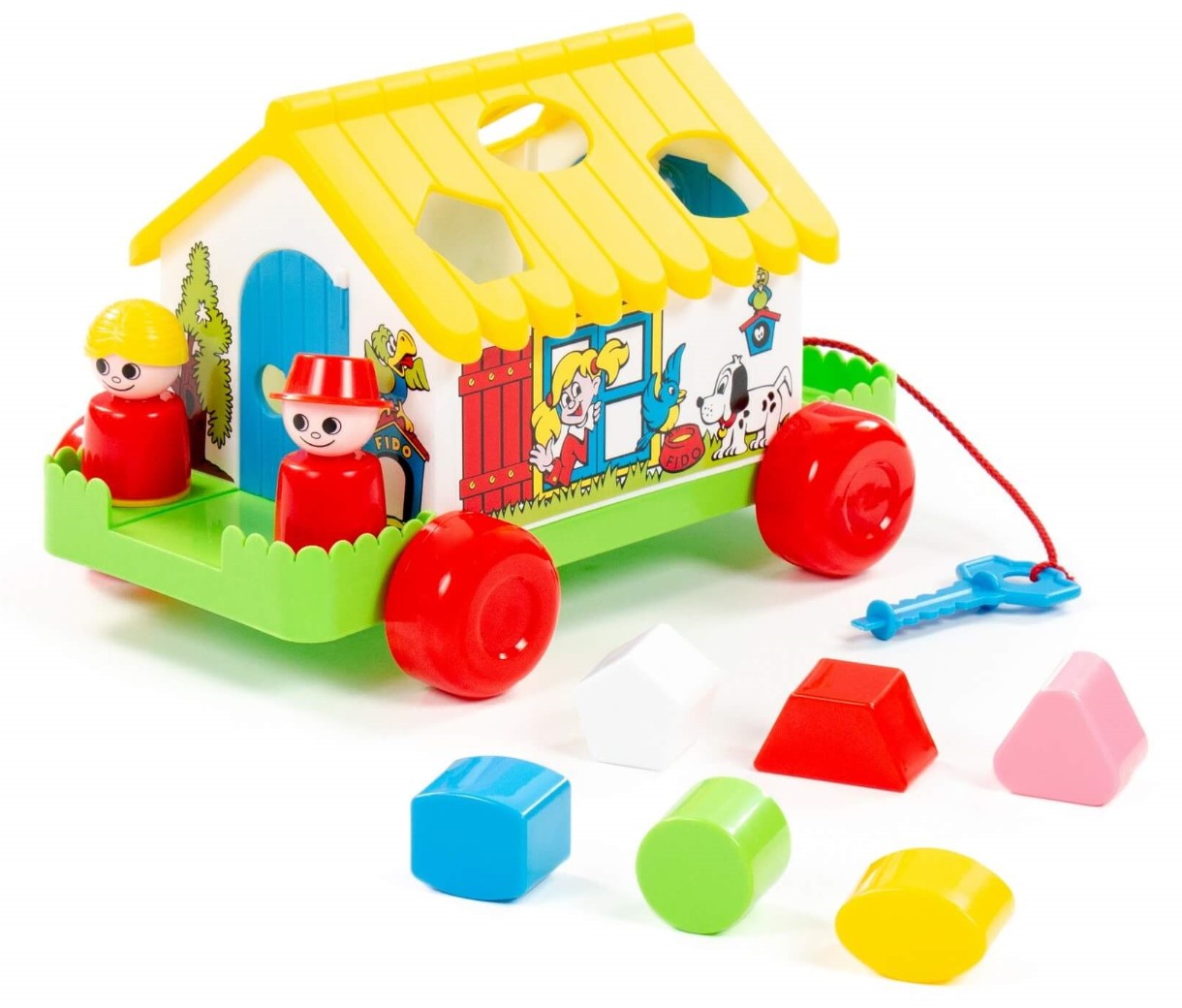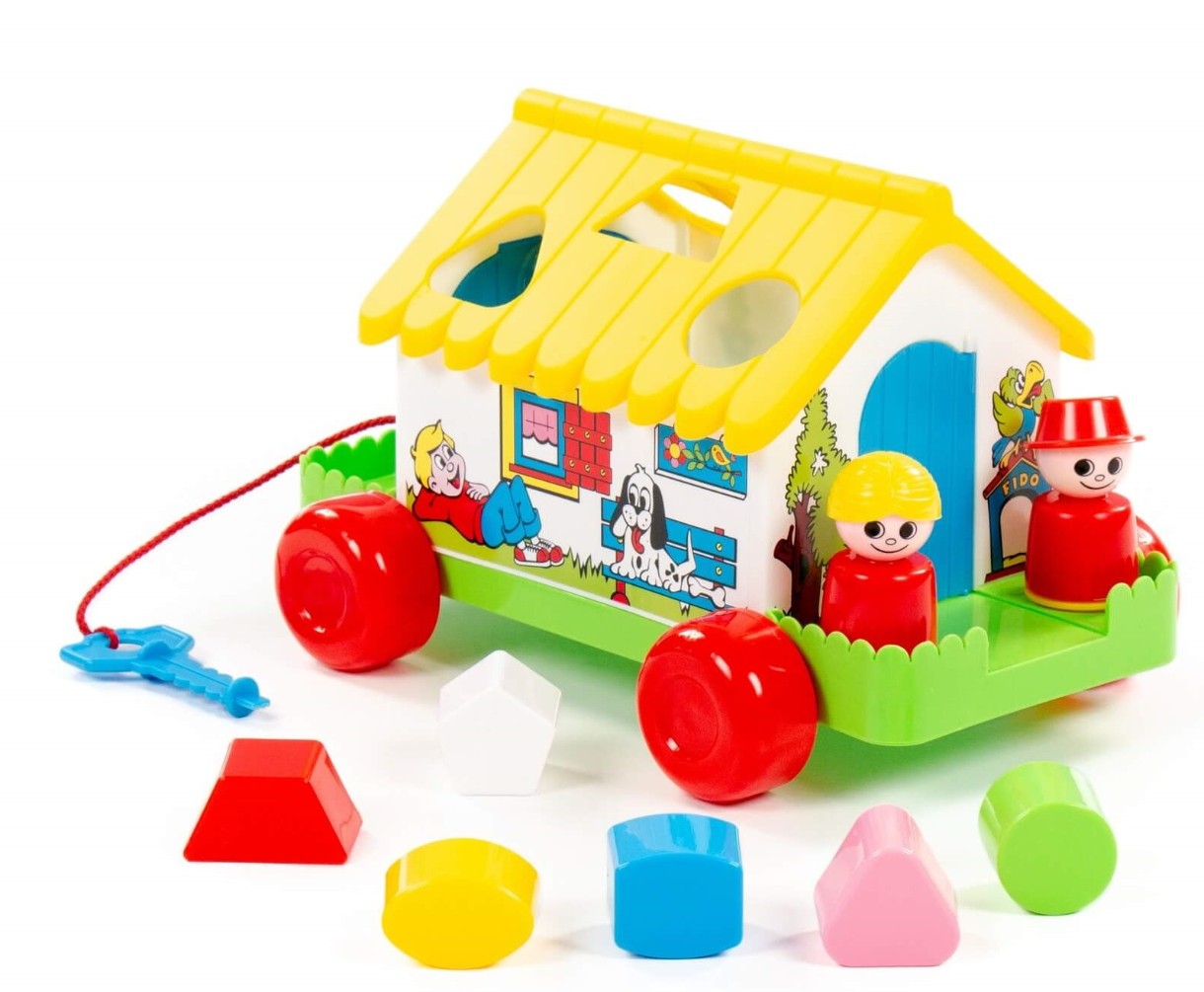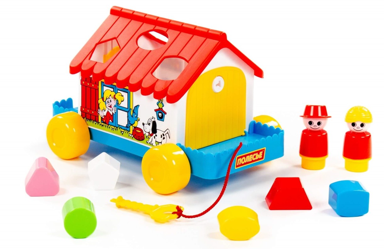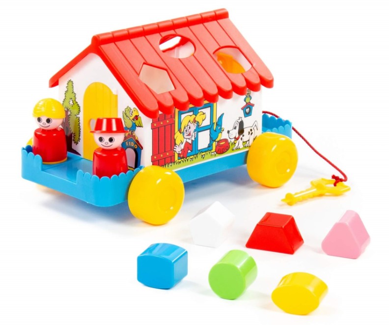Развивающий домик для детей до 3-х лет. На крыше домика логическая задача - ребёнку нужно сопоставить фигурки (6 шт.) с отверстиями-пазлами. С двух сторон домика есть дверки, которые открываются, и можно достать из домика фигурки. Одна из дверок открывается ключом. Кроме того, в комплект входят 2 фигурки человечков, они устанавливаются в специальные углубления и позволяют ребёнку разыгрывать различные сюжеты. Домик можно катать благодаря наличию колёсиков и шнурка.