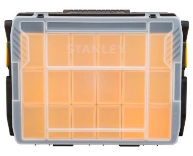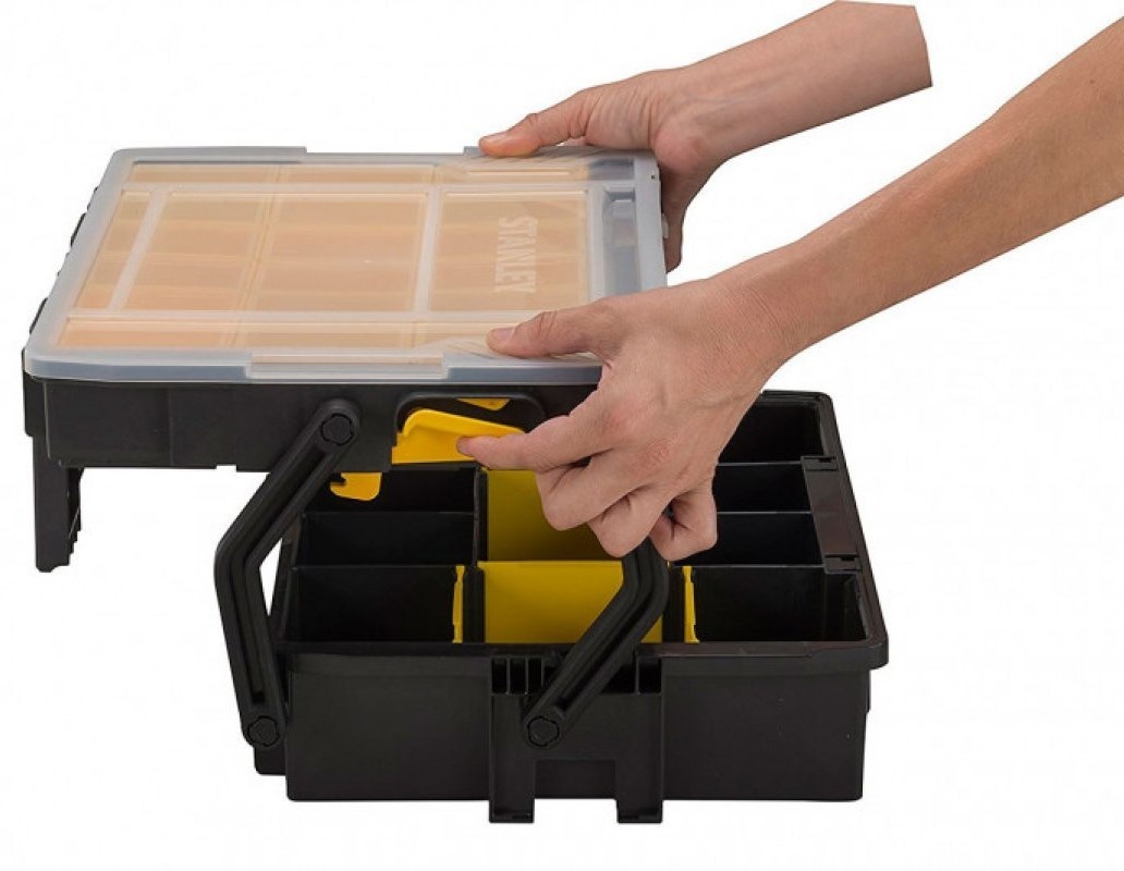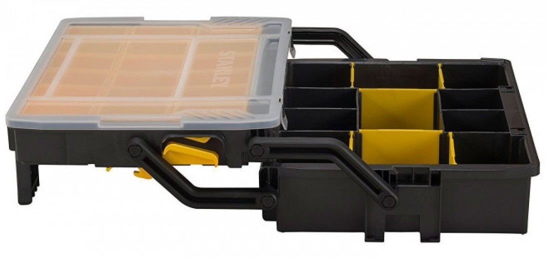 Органайзер STANLEY SortMaster STST1-7554 — изготовлен из прочного пластика и оснащен надежными петлями, благодаря чему устойчив к ударам и прослужит длительное время. Достаточно прочные пластиковые замки имеют большой ресурс на открывание и закрывание. Особенностью органайзера является его форма, которая в закрытом состоянии становится кейсом, а в открытом состоянии большим органайзером с раздвижными секциями, благодаря которым пользователь получает хороший обзор и свободный доступ к содержимому. Данный органайзер является удобным и практичным местом хранения инструмента, который обеспечивает хороший обзор содержимого, позволяет вовремя отслеживать количество оставшихся деталей и вовремя пополнять запас.