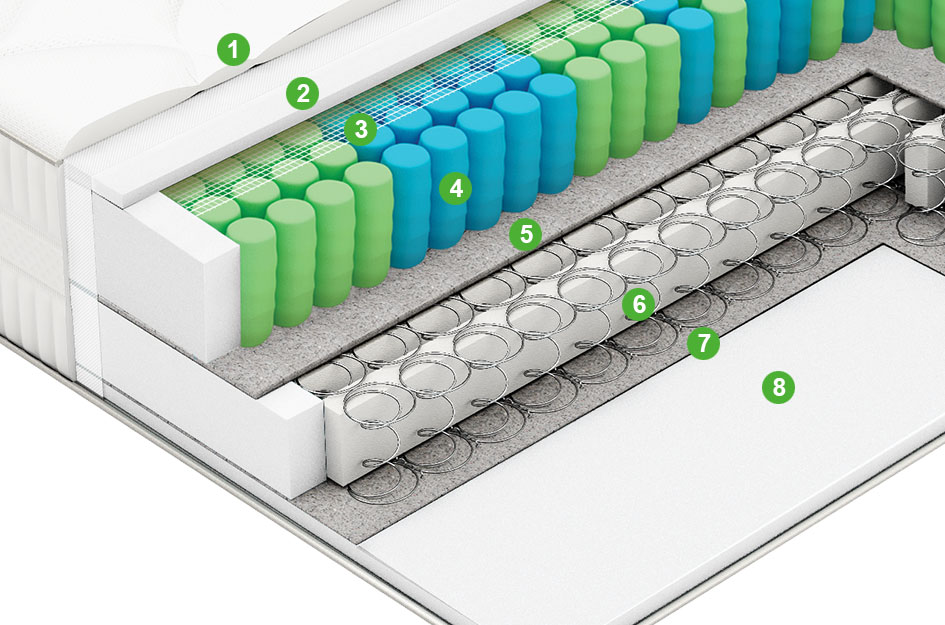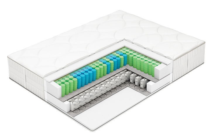 Первый уровень — базовый, на основе блока независимых пружин с 7-ю поперечными зонами, чья жесткость специально подобрана для оптимальной поддержки отдельных зон тела (плечи, спина, бедра и т.д.).