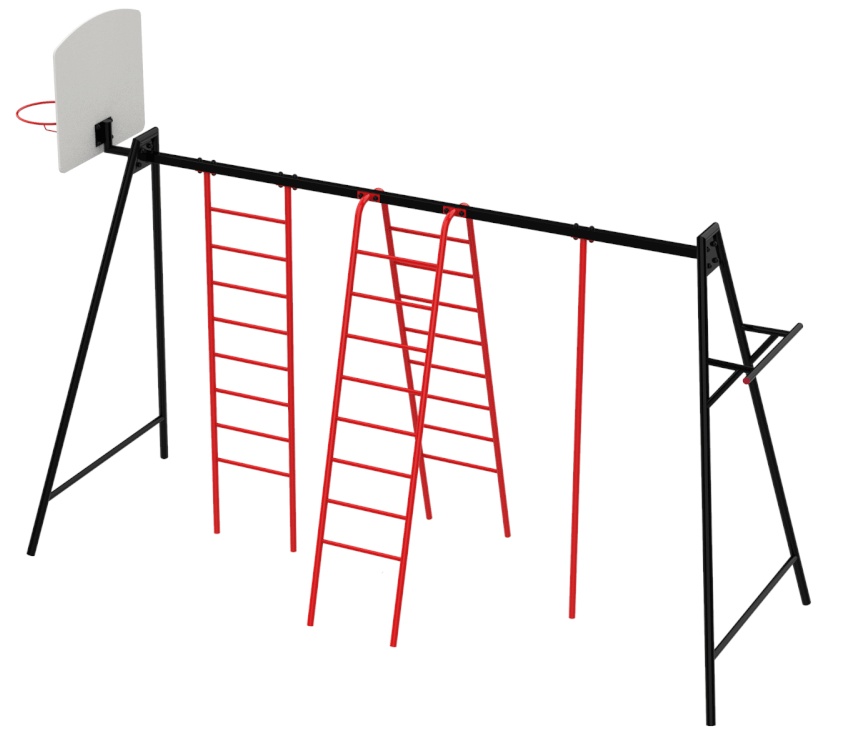 Позволяет вести активный и здоровый образ жизни, интересные игры на свежем воздухе. Многофункциональный спортивный комплекс состоит из множества турников, стенки для скалолазания и других спортивных элементов.
