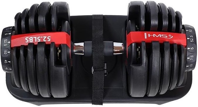 SR-52 HMS — регулируемая гантель. В комплект входят гриф, 10 пластин и подставка. Устройство идеально подходит для людей, занимающихся спортом дома, а также и для тренажерного зала, заменяя всю стойку традиционных гантелей. Это прогрессивное решение для любителей силовых тренировок.