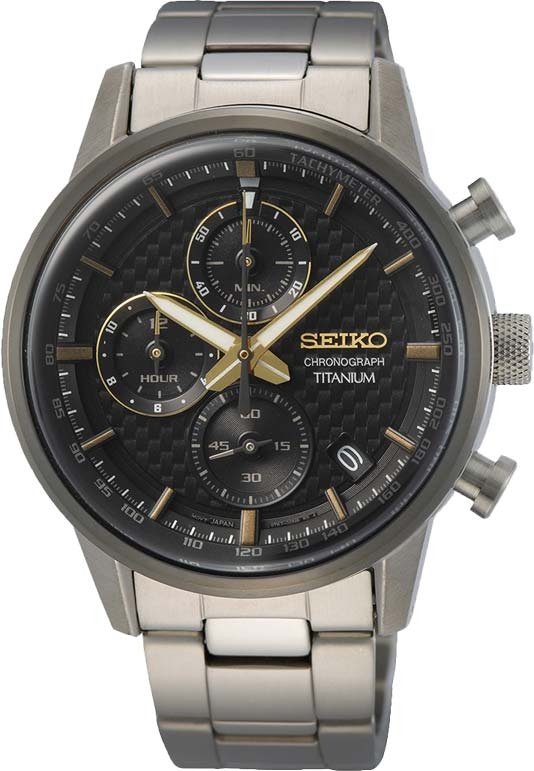 Стильный японский хронограф с титановым корпусом станет отличным помощником в вопросах времени. Discover More. Часы-хронограф с секундомером и тахиметром. Секундомер до 1ч, точность 1/5с. Метки в виде штрихов. Циферблат стилизован под карбон. Окошко даты. Рифленая заводная головка. Завинчивающаяся задняя крышка. Браслет с тройной раскладывающейся застежкой.