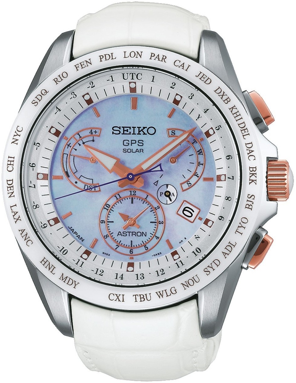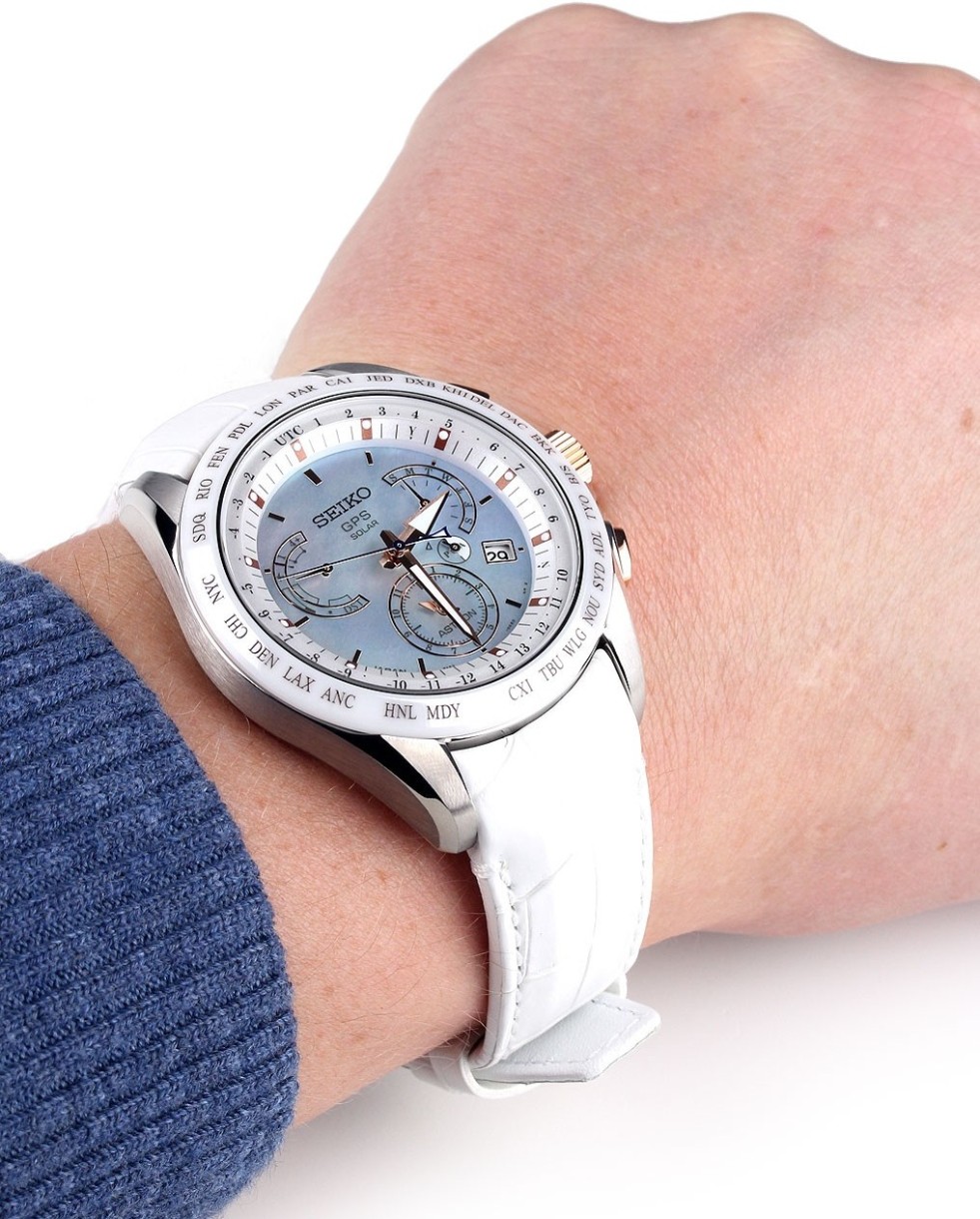 GPS Solar Dual-Time. Унисекс. Часы со встроенным GPS-приемником определяют часовой пояс, дату и точное время. Питание от солнечной энергии, индикатор уровня зарядки батареи. Защищены от магнитных полей (до 4800 А/м). Функция сохранения энергии. Запас хода при включенной функции сохранения энергии до 2 лет. Ручная и автоматическая корректировка времени и часового пояса. Установка летнего времени. Функции приема GPS-сигнала: режим ''В полете'', показ количества спутников, показ результата последнего приема, проверка установленного часового пояса. Мировое время - часы распознают все 40 часовых поясов. Второй часовой пояс с индикацией AM/PM. Ретроградный индикатор отображает: состояние зарядки батареи, режим ''В полете'', включение/отключение летнего времени, способ приема GPS-сигнала и день недели. Керамический безель. Заводная головка с защитой. Завинчивающаяся задняя крышка. Ремешок из кожи крокодила с раскладывающейся застежкой. Застежка с системой блокировки.